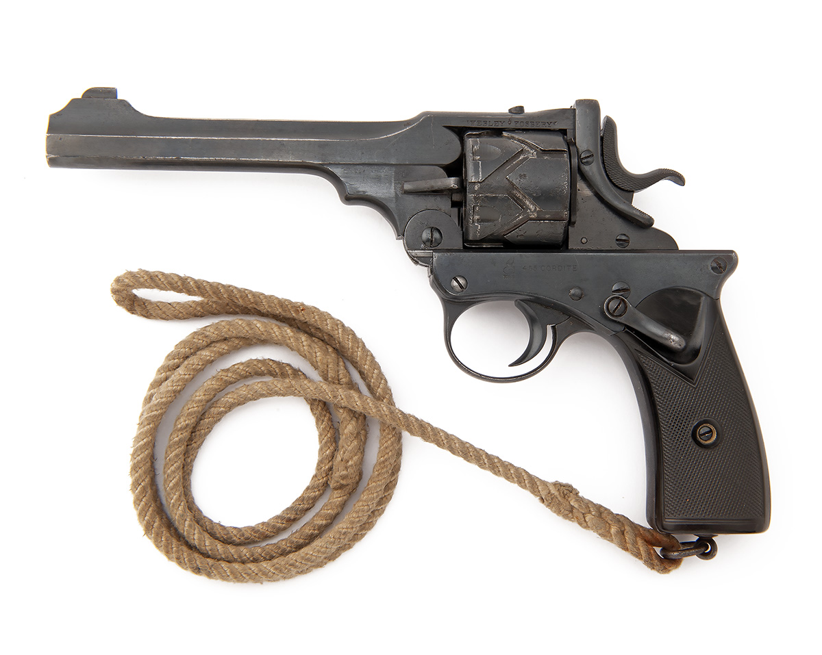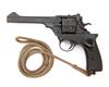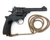 circa 1904, with re-blued 6in. sighted barrel, stirrup catch with notch rear-sight, blued cylinder with 'zig-zag' indexing grooves and front locking notches (pitted externally), blued frame with detachable side-plate, the right hand side also numbered 'FU747', safety lever mounted on left hand side, chequered hard-rubber grips, the heel stamped '1916', lanyard ring at base retaining a period lanyard, the whole refinished