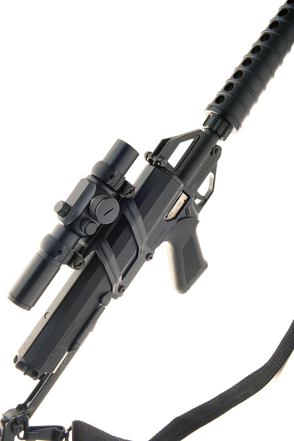 CALICO .22 L.R. 'MODEL M-100' SELF-LOADING SPORTING RIFLE, serial no. A009627, 17 3/4in. nitro barrel, fitted with a Tasco Pro Point sight, detachable drum type magazine, folding stock, canvas sling