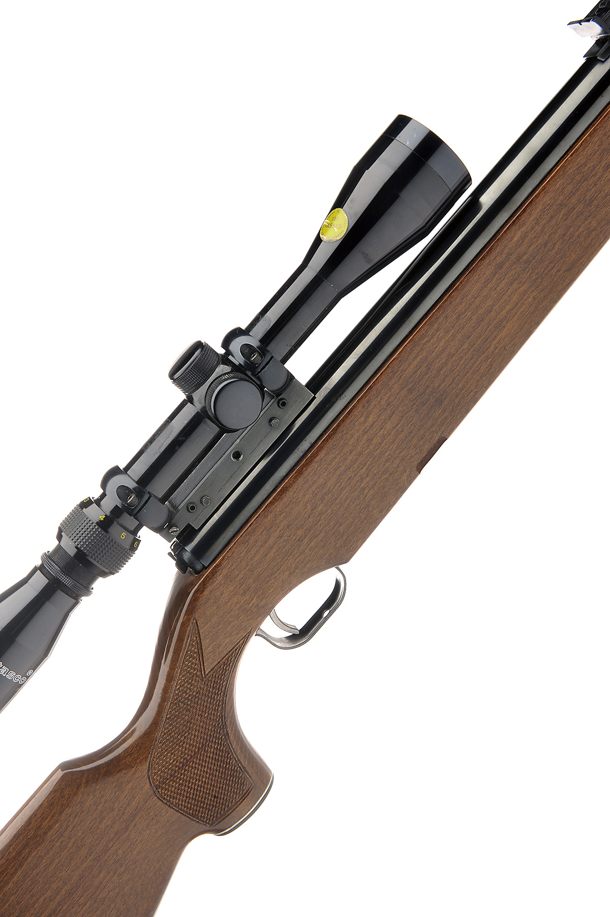 A .22 BREAK-BARREL AIR-RIFLE SIGNED FEINWERKBAU, MODEL 'FWB127', serial no. 50806, with blued 18 1/4in. barrel (fore-sight absent), blued air-chamber with rear-mounted safe and beech half-stock fitted with a period TASCO 3-9x40 telescopic sight on a dedicated period 'Apel' mount, collector's condition