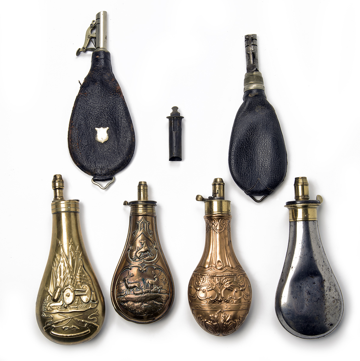 * A GROUP OF FOUR POWDER FLASKS AND TWO SHOT FLASKS FOR SPORTING GUNS, mixed periods, all with faults, being 1) embossed both sides with floral design and fluting, graduated spout, some denting, spring broken, 8 in.; 2) plain steel bag shaped, graduated spout, marked 'EXTRA QUALITY / SYKES PATENT', spring at fault, body holed below neck, missing its leather body cover, 8 1/4 in.; 3) reproduction American Civil War, embossed both sides with stand of arms, sprung nozzle, missing suspension loops, 9 in.; 4) embossed both sides with dog and deer scene, graduated spout, spout mouth dented, missing graduation screw, spring broken, 7 1/2 in.; plus x2 black leather shot flasks, one with a white metal shield escutcheon, seams split, approx. 9 in. each