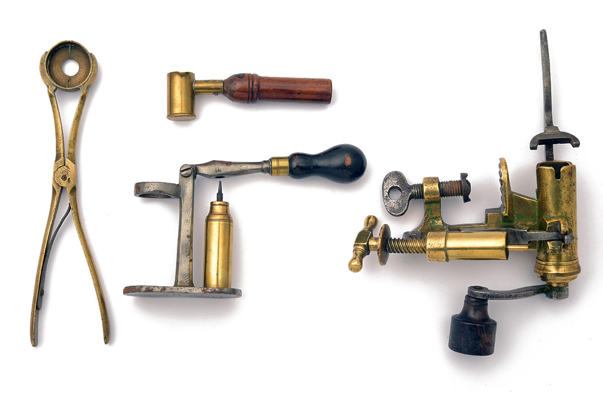* A GROUP OF FOUR TOOLS FOR SPORTING GUNS, mid-late 19th Century, all unnamed, being a decapper/sizer, a rare brass 12-bore roll turnover tool with an attached side decapper, missing a handle, a combined powder and shot measure, and an unknown brass sprung-handled tool
