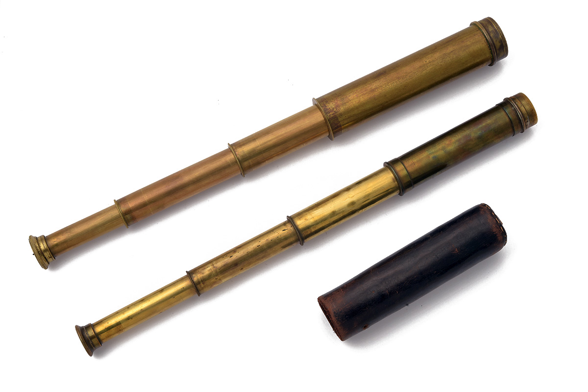 late 19th Century, unnamed, 1)14 in. extended, 5 in. closed, some shallow knocks to the tubes, with its leather case, missing the cap; 2) 17 in. extended, 6 in. closed, non-functioning