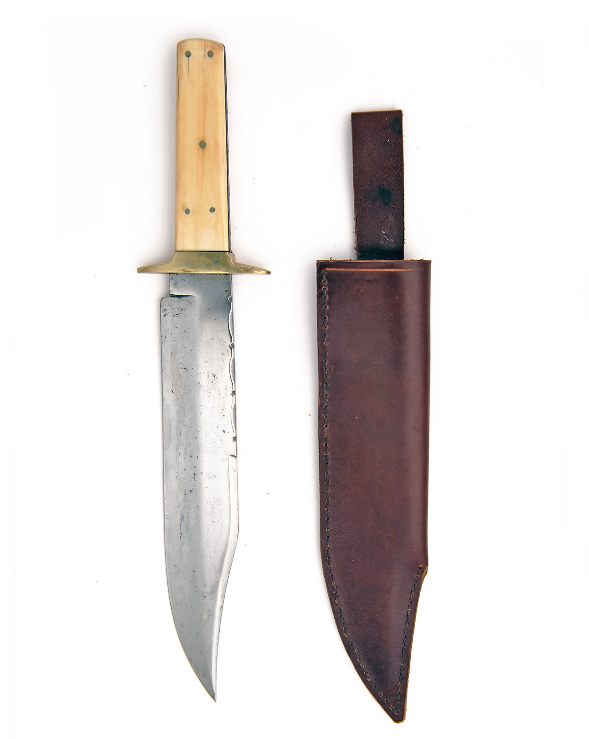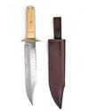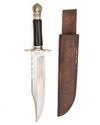 TWO LARGE BOWIE-KNIVES SIGNED J.E. MIDDLETON & SONS, both with 9 1/2in. blades, one with white metal mounts and turned buffalo horn hilt, the other brass mounted with possible ivory scales, both with leather scabbards (2)