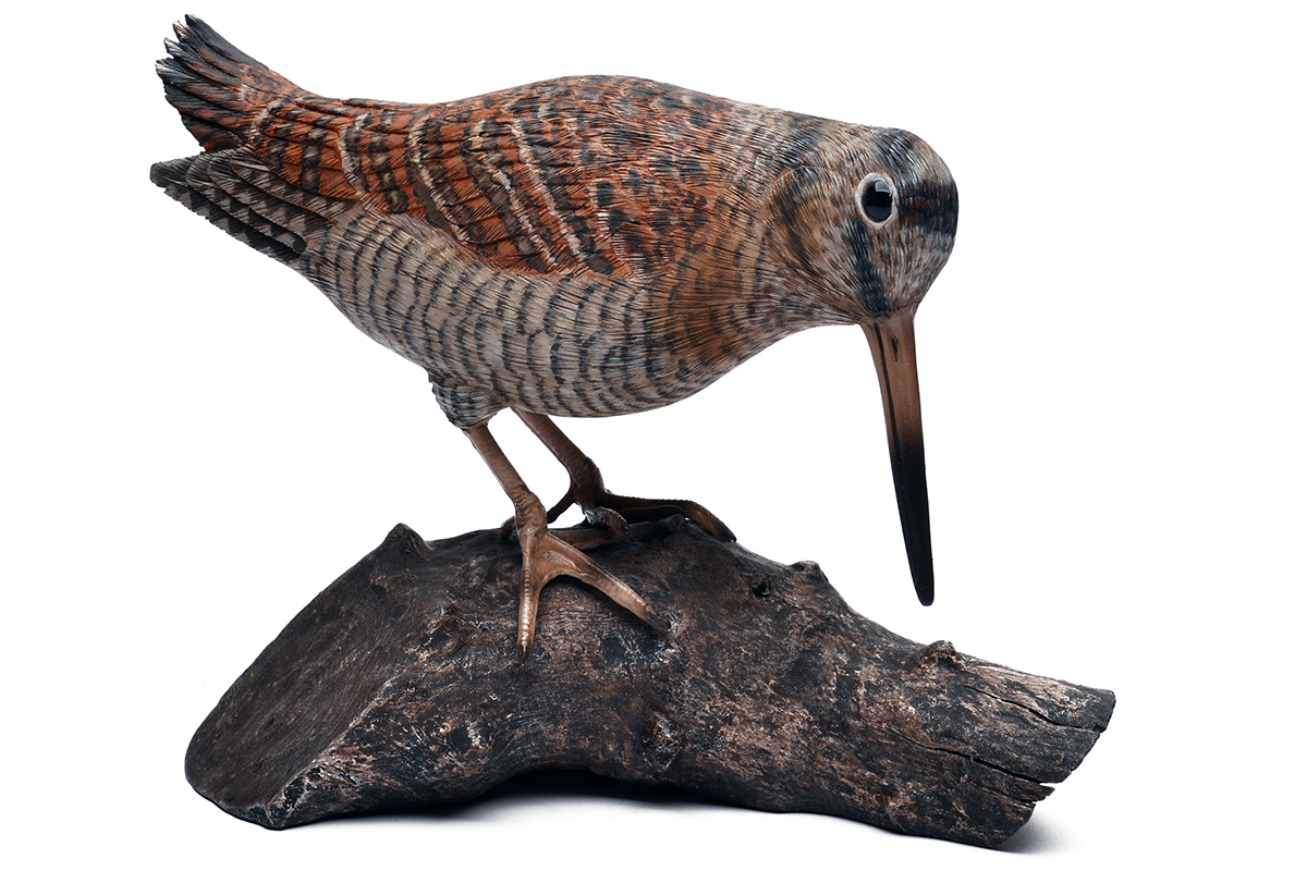 MIKE WOOD A FINE HAND-CARVED WOODCOCK,