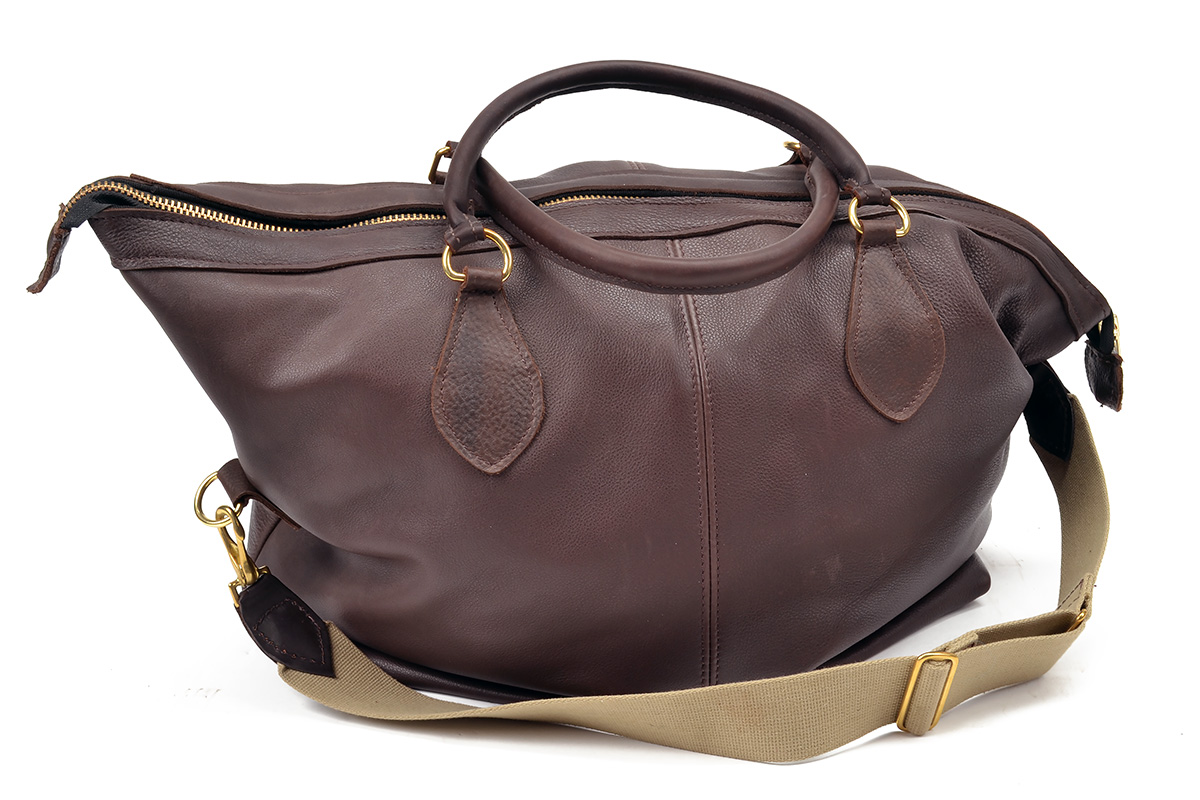 with canvas and leather shoulder strap, leather carry handles, brass fittings