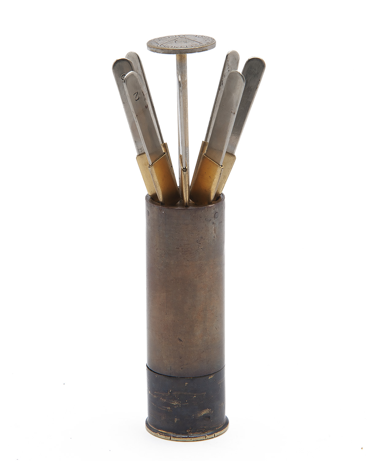 the body of brass, eight numbered white metal pegs in gilt mounts, the base twisting to display the pegs in umbrella form, the wad card marked '6 SMOKELESS - LOADED BY ASPREY', the base marked headstamp with 'ASPREY'S CARTRIDGE PLACE FINDER PATENT APPLIED FOR'