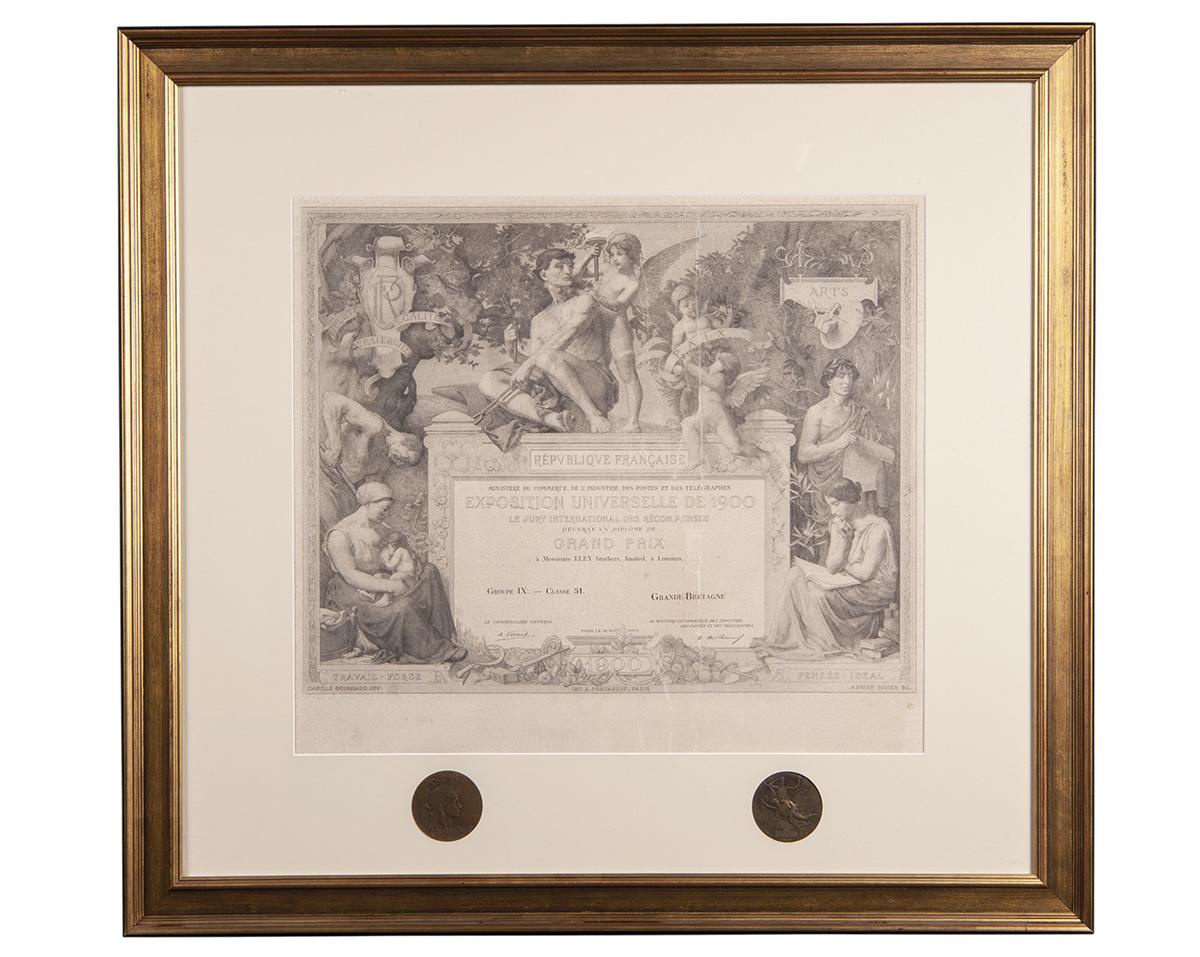 EXPOSITION UNIVERSELLE DE 1900 - ELEY A FRAMED GRAND PRIX AWARD CERTIFICATE WITH TWO MEDALLIONS,