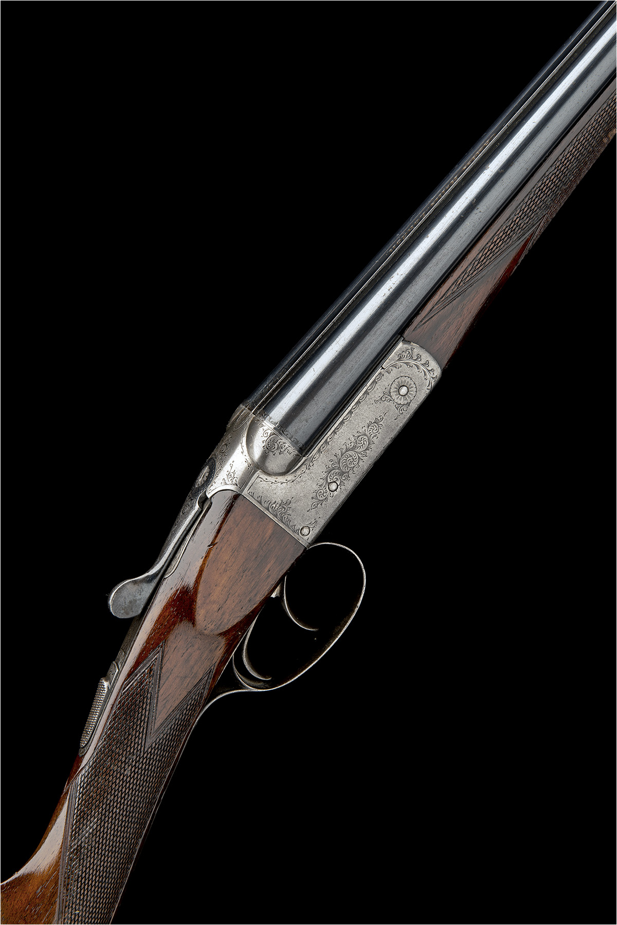 26in. nitro barrels, the rib engraved 'CHARLES HELLIS, LONDON', 2 1/2in. chambers, bored approx. true cyl. and 1/2 choke, unsigned action with border and acanthus scroll engraving, automatic safety with 'SAFE' inlaid detail, 14 1/4in. stock, weight 4lb. 3oz.