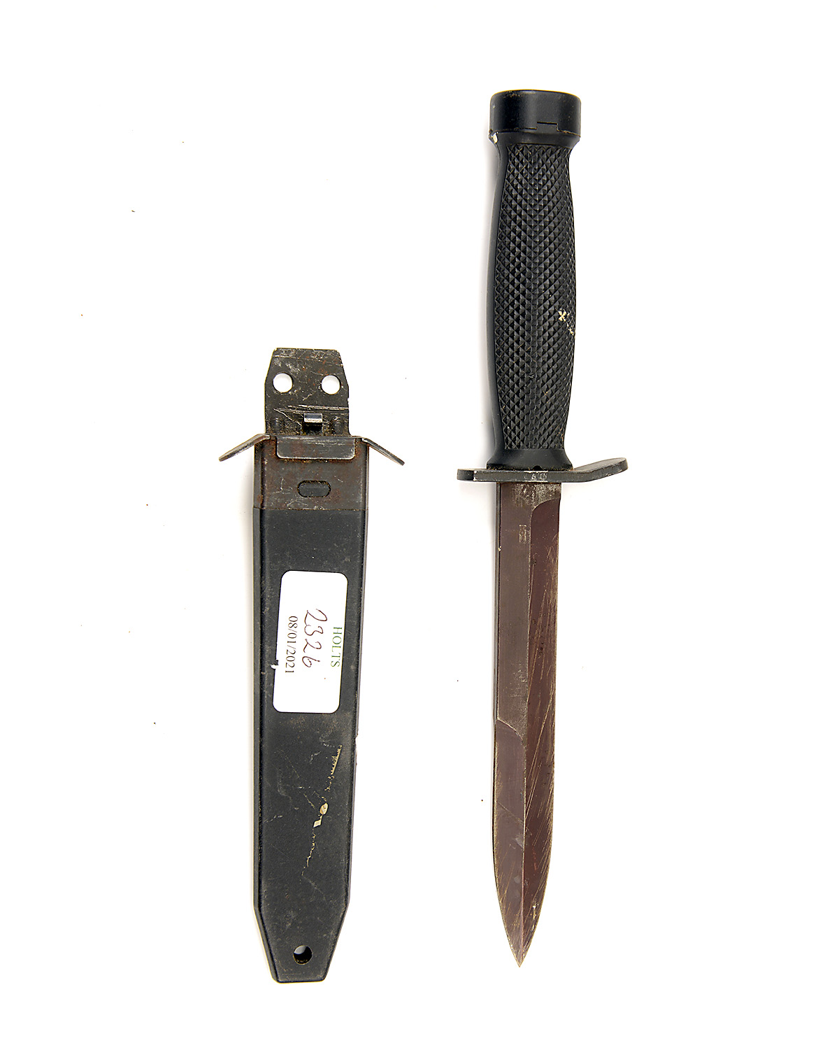 A U.S. M3 MILITARY KNIFE, late model with parkerised blade, black composite chequered handle with heavy iron pommel and black abs plastic scabbard, missing webbing belt attachment