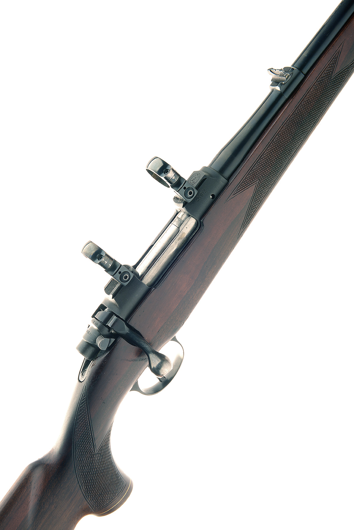 BRNO ARMS .243 WIN. 'MODEL ZKK-601' BOLT-MAGAZINE SPORTING RIFLE, serial no. 45102, 23 5/8in. nitro barrel, threaded for sound moderator, ramp mounted fore-sight bead missing, leaf rear-sight, fitted with 24mm scope rings, manual safety, hinged floorplate, 13 3/4in. well-figured pistolgrip stock )including recoil pad) with cheekpiece, sling eyes