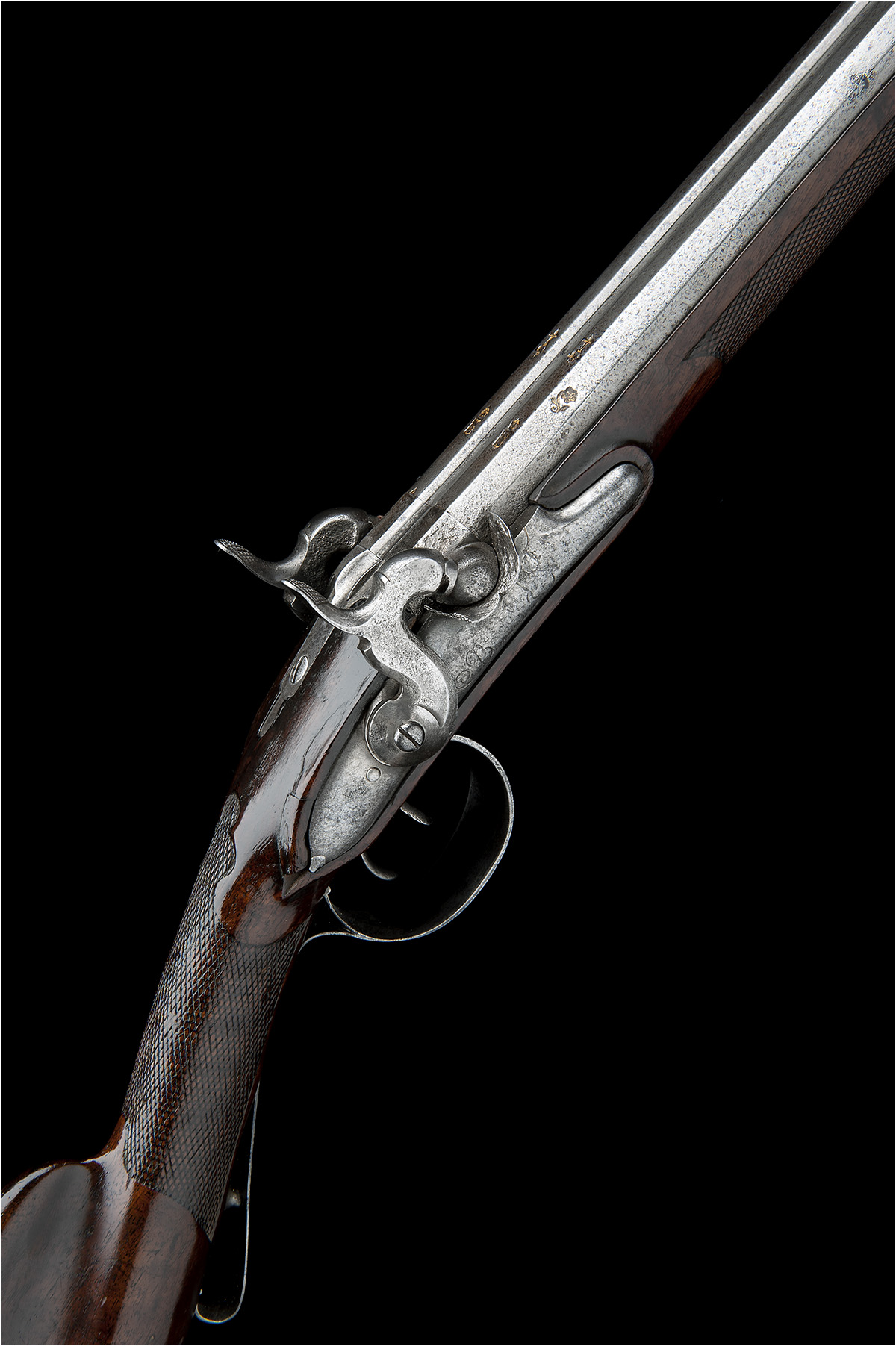 A 22-BORE PERCUSSION DOUBLE-BARRELLED SPORTING-GUN SIGNED 'BOUILLIET', no visible serial number,