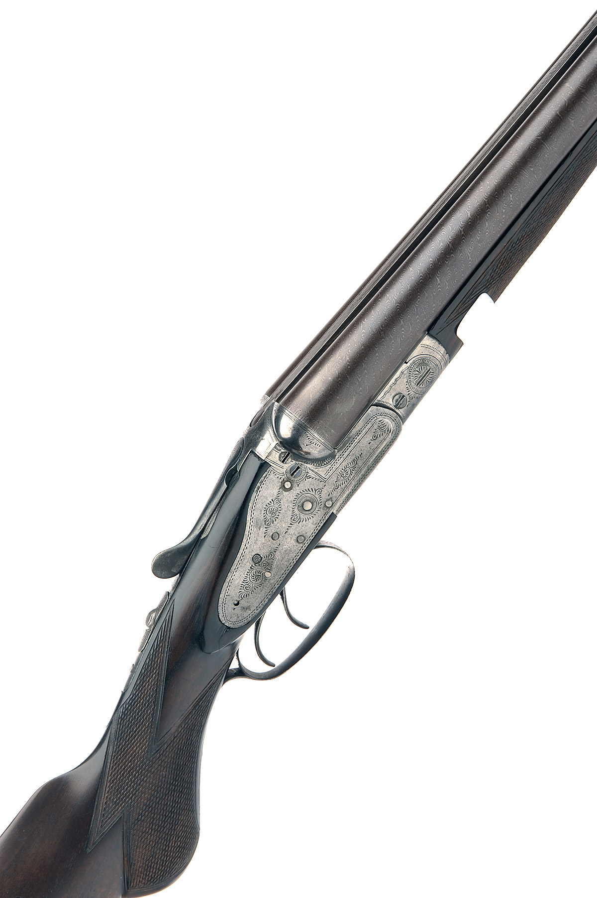 C. CHISHOLM & SON 12-BORE SIDELOCK NON-EJECTOR, serial no. 84954, 30in. nitro reproved damascus barrels, the rib engraved 'C. CHISHOLM & SON.', 2 1/2in. chambers, bored approx. 1/4 and 3/4 choke, (left wall at 19 thou), treble-grip action, automatic safety with inlaid 'SAFE' detail, border and partial scroll engraving, brushed bright finish, 13 3/4in. semi-pistolgrip stock including buttplate, weight 6lb. 12oz.