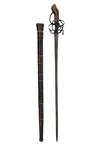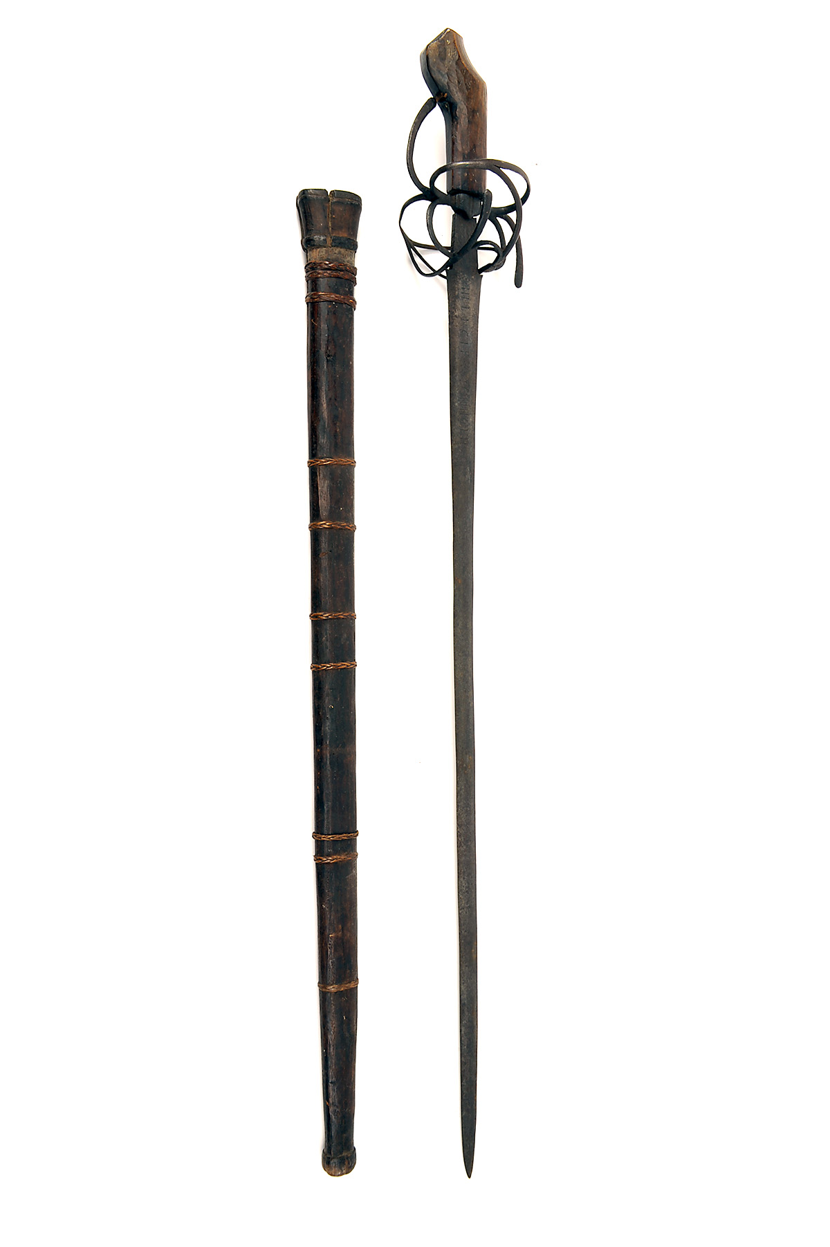 AN EARLY RAPIER WITH LATER INDONESIAN HILT, the blade early to mid 16th century, heavily work sharpened and thinned 33 1/2in. blade and with broad central shallow fullers marked 'ME FECIT SOLINGEN', complex iron multi-bar hilt, the knuckle-guard modified and fitted with a carved wood hilt (possibly from Sumba), the blade housed in a rattan bound wood scabbard