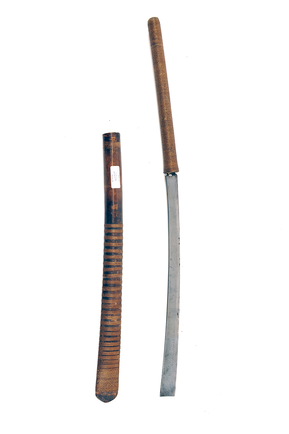 A BURMESE DHA SWORD, early 20th century, with 19in. flat-tipped blade, plain reed-bound wood hilt and wood scabbard with further decorative reed binding