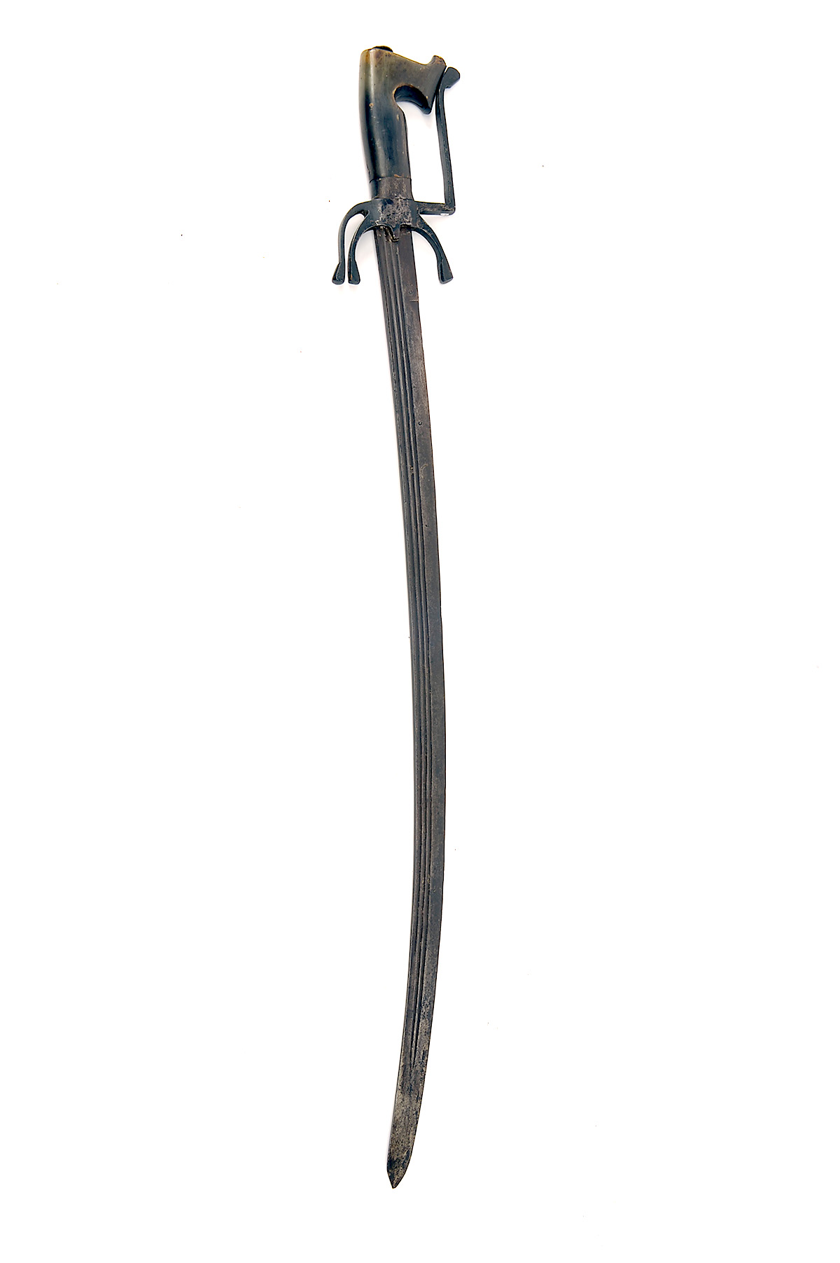 AN ARABIC NIMCHA SWORD WITH HORN HILT, possibly early 18th century, with curved 30in. blade stamped with moon and star devices and with three narrow fullers to the back edge, anthropomorphic iron hilt with shaped horn grip, no scabbard