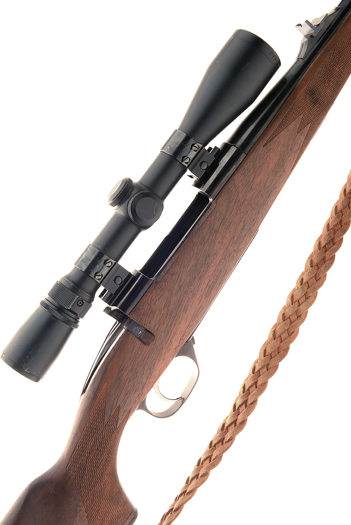 MUSGRAVE .243 'MODEL 90 BOLT-MAGAZINE SPORTING RIFLE, serial no. L90 0118A, 22in. nitro barrel, ramp-mounted bead fore-sight, v-notch rear-sight, fitted with a Weaver 3-9x 40 telescopic sight, bolt missing, hinged floorplate, 13 3/4in. well-figured pistolgrip stock (including recoil pad), leather sling