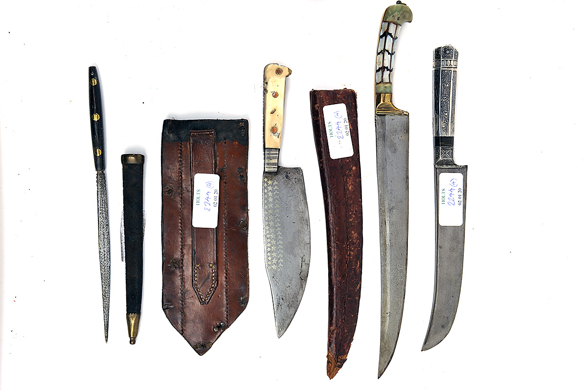 A COLLECTION OF FOUR INDO-PERSIAN KNIVES, all late 19th to early 20th century, the first with deep 5in. blade decorated with white metal inlays and fitted with a horn hilt. in a modified leather scabbard from another dated '1915', the second of narrow stiletto form with false damascening to the 5 1/2in. blade, in a leather scabbard, the third with curved watered 9in. blade and hilt with mother of pearl inlays, also with a leather scabbard and the last with curved 6 1/4in. blade fitted to a silver nielloed faceted hilt, no scabbard (4)