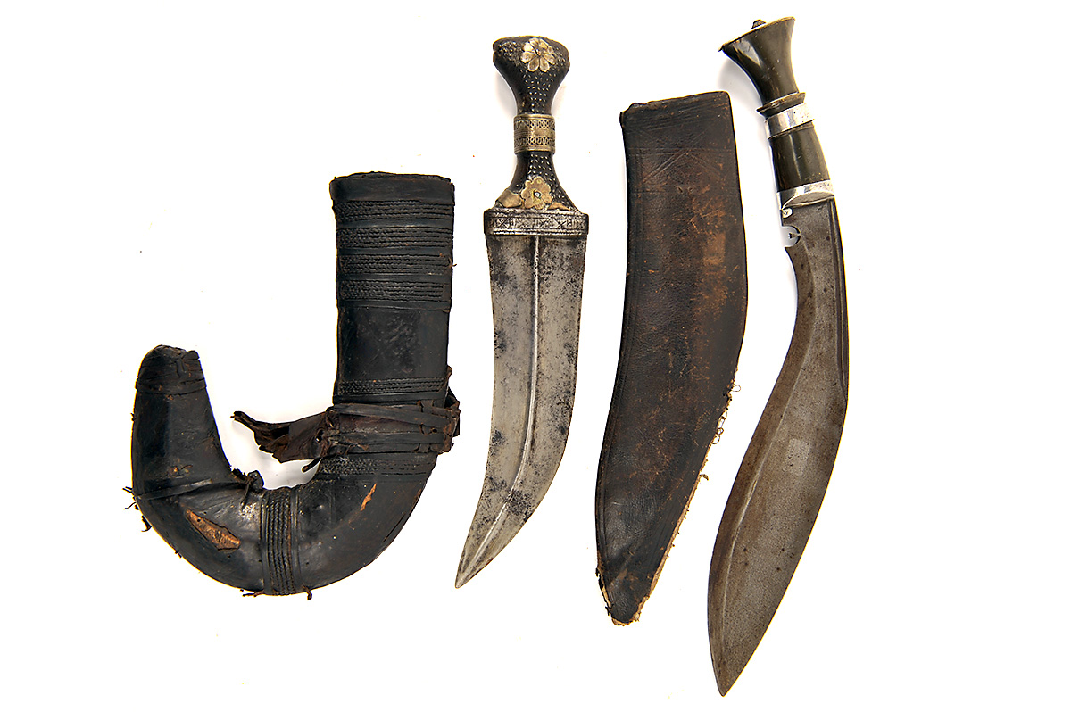 A YEMENI JAMBIYA AND A NEPALESE KUKRI both late 19th to early 20th century, complete with their scabbards, wear and losses to both (2)
