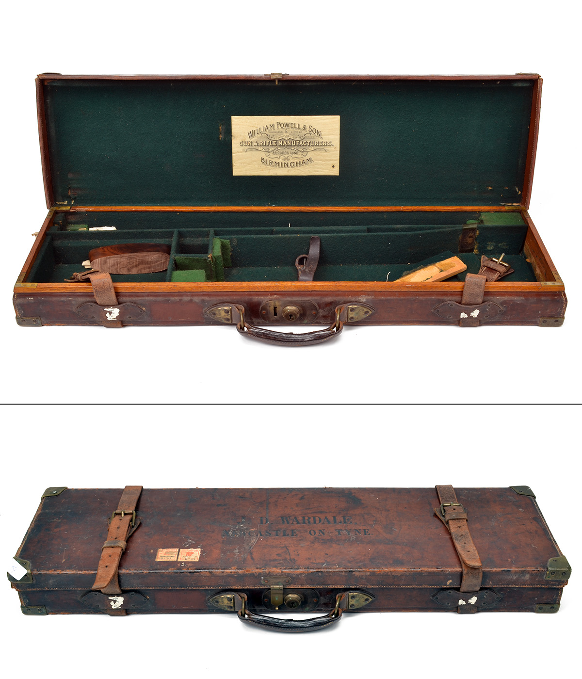 fitted for fitted for 28in. barrels (could adapt to 31in.), the interior lined with green baize, a William Powell trade label, brass lock (key missing), the lid exterior embossed with 'D. WARDALE NEWCASTLE-ON-TYNE'