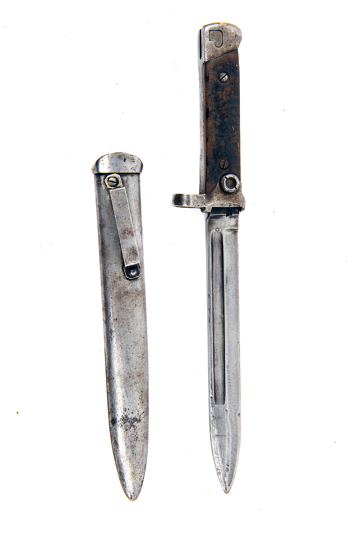 A SCARCE ITALIAN CARCANO RIFLE FOLDING BAYONET, circa 1938, with single edged 7in. blade folding into the handle, wood scales and iron scabbard