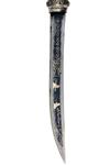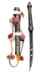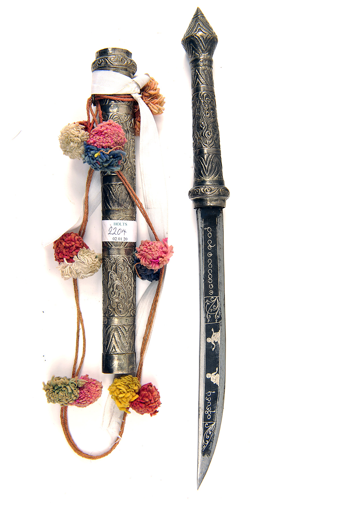 A WHITE METAL MOUNTED TIBETAN DHA SWORD, with 11in. decorated blade. moulded and embossed hily with en-suite scabbard, complete with woollen sword knots, recent