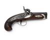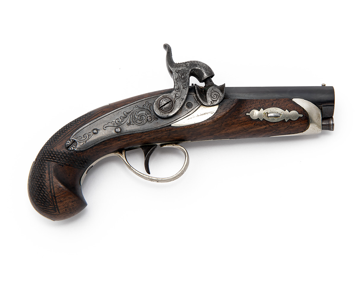 circa 1840, with Birmingham proved octagonal to round 3 1/8in. barrel, engraved breech and top-tang, fenced nipple, borderline and scroll engraved back-action lock with nickel-silver bolster, slab-sided hammer, walnut full-stock with chequered birdshead butt, nickel tear-drop heel-plate, engraved nickel trigger-guard and plain nose-cap with iron ramrod