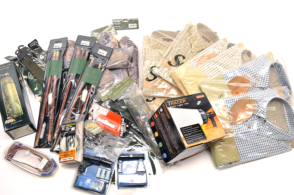 † A COLLECTION NEW AND UNUSED OF SHOOTING RELATED CLOTHING AND SHOOTING ACCESSORIES, comprising of 2 x Hawke optics, 2 x Allan ear plugs, Bisley shooting gloves, 2 x Parker-Hale nylon brushes, vacuum flask, Hawke sport optics, 5 x RW2 20 bore wallets, Hoppes .243 bore snake, Hoppes .17 bore snake, Deben 6 pk ferret coller, Hoppes 10-bore snake, Hoppes .410 bore anke, Hoppes 12 bore snake, Ruag 20 bore ammotec, game carrier, konvs bi-pod Tracer 140mm sport light, 4 x size large Sherwood long sleeve shirts, 2 x Sealand size large shirts, 1 Sealand medium shirt, 2 x Bisley ties, 4 x neoprene scope covers, moderator cover