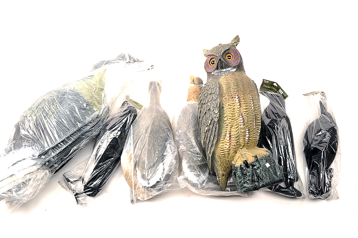 A COLLECTION OF NEW AND UNUSED BIRD DECOYS, comprising of 4 x shell geese decoys with stands, 4 x Jack pyke flocked crow decoys, 2 x duck decoys with rotation wings, a large plastic owl