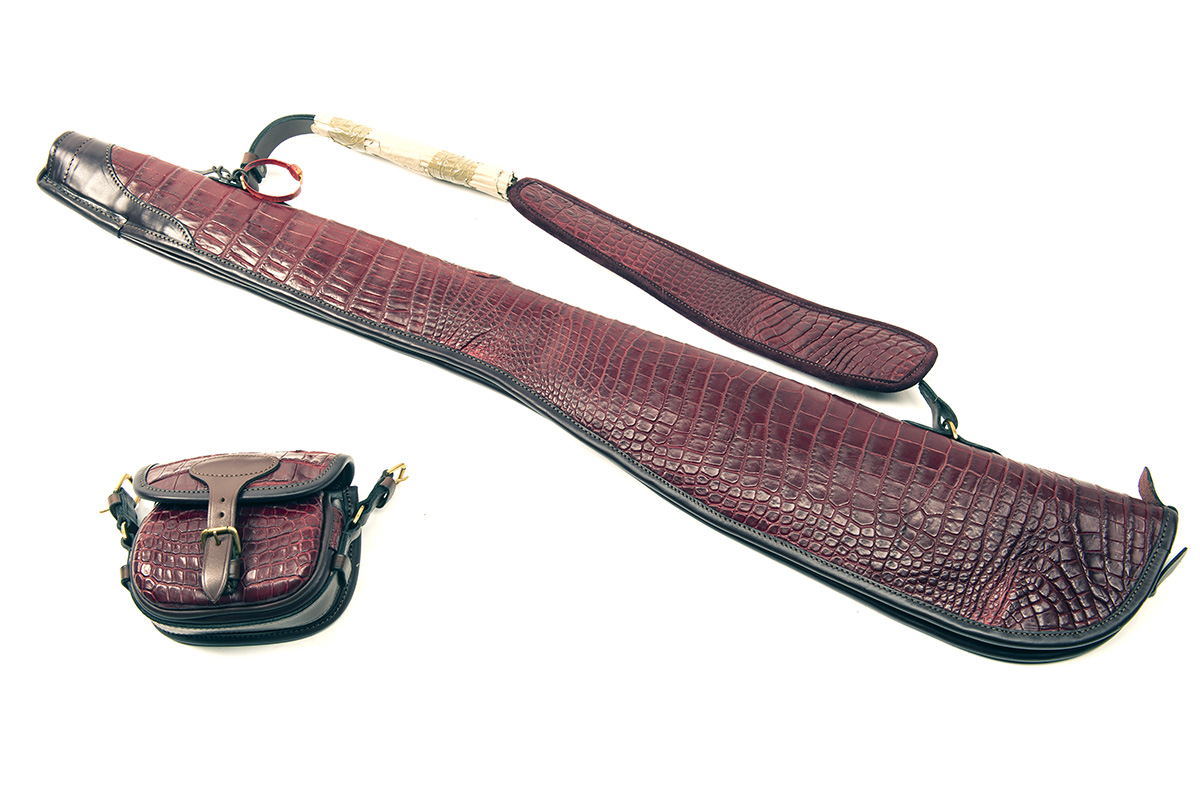 AN UNUSED CROCODILE SKIN FLEECE-LINED SINGLE GUNSLIP WITH MATCHING CARTRIDGE BAG,