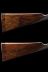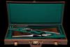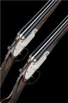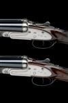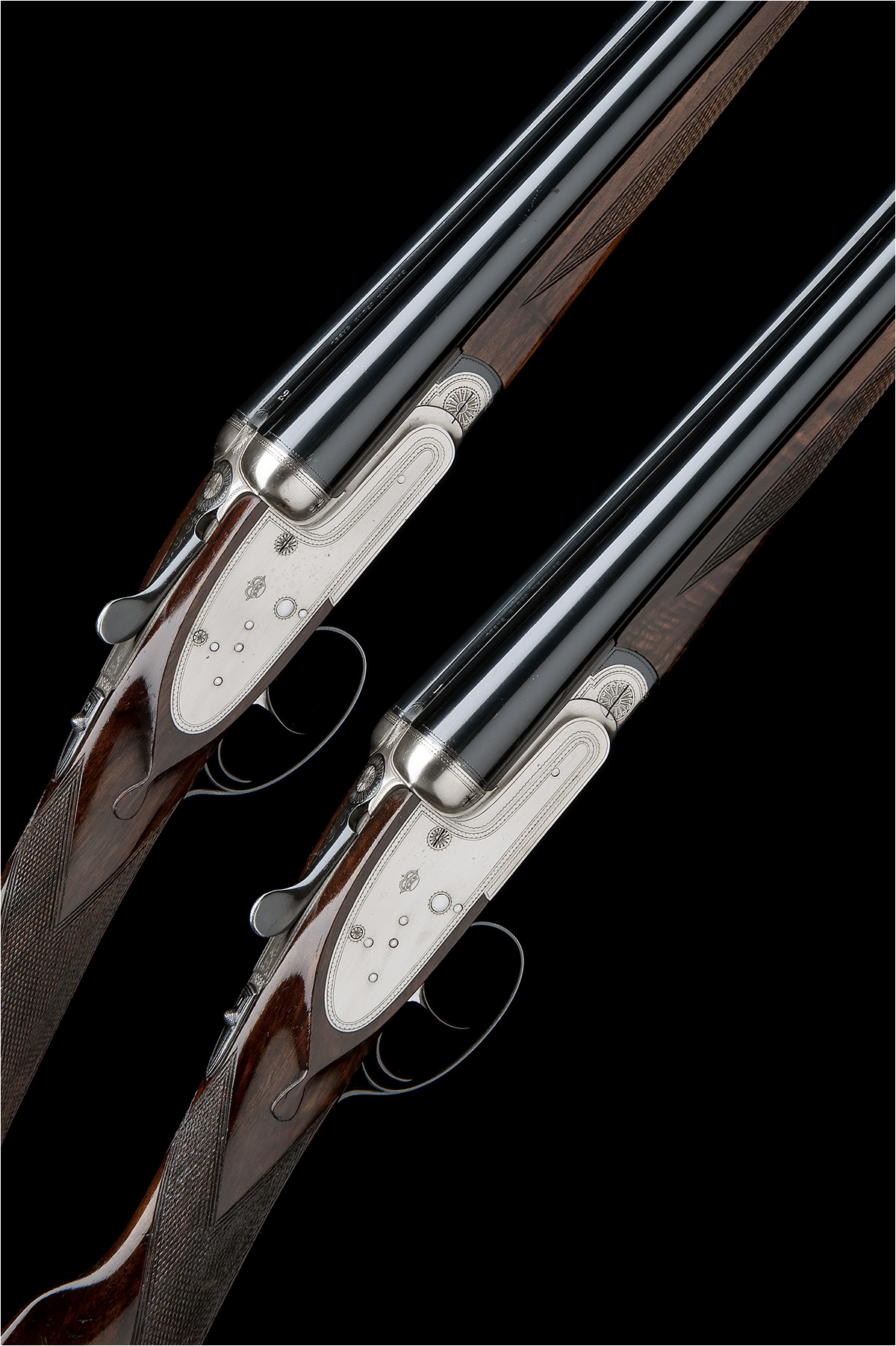 27in. nitro chopperlump barrels, the ribs engraved 'GUNMARK CROWN SABEL' and '1' and '2', 2 3/4in. chambers, bored approx. imp. cyl. and 1/2 choke in both, automatic safeties with engraved 'SAFE' details, removable striker discs, articulated front triggers, beaded border engraving, the lockplates with central crown motifs, bright and blued finish overall, 15 1/4in. stocks including 7/8in. wooden extensions, weight 6lb. 1oz. (No.1), 6lb. (No.2), in their leather case