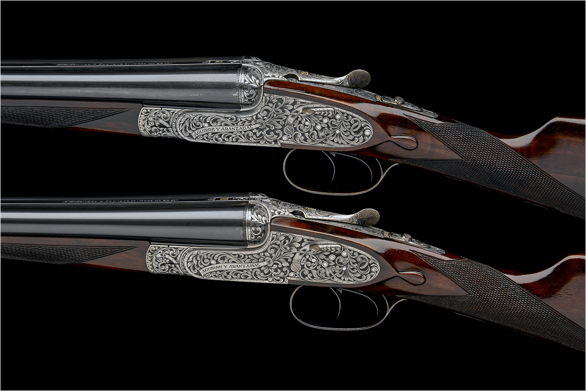 26 1/2in. nitro chopperlump barrels, the ribs gold-inlaid '1' and '2', and engraved 'AYA - AGUIRRE & ARANZABAL - MADE IN SPAIN', 2 3/4in. chambers, bored approx. 1/4 and 1/2 choke (both), toplevers gold-inlaid '1' and '2', automatic safeties with gold-inlaid 'SAFE' details, hand-detachable lockplates, gold-inlaid cocking-indicators, articulated front triggers, rolled-edge triggerguards, engraved with bold foliate acanthus scrollwork set against a matt background, the triggerplates signed 'G. Moore.', bright finishes, the triggerplates colour-hardened, 15in. figured stocks, weight 5lb. 3oz., in a leather double motorcase with canvas outer