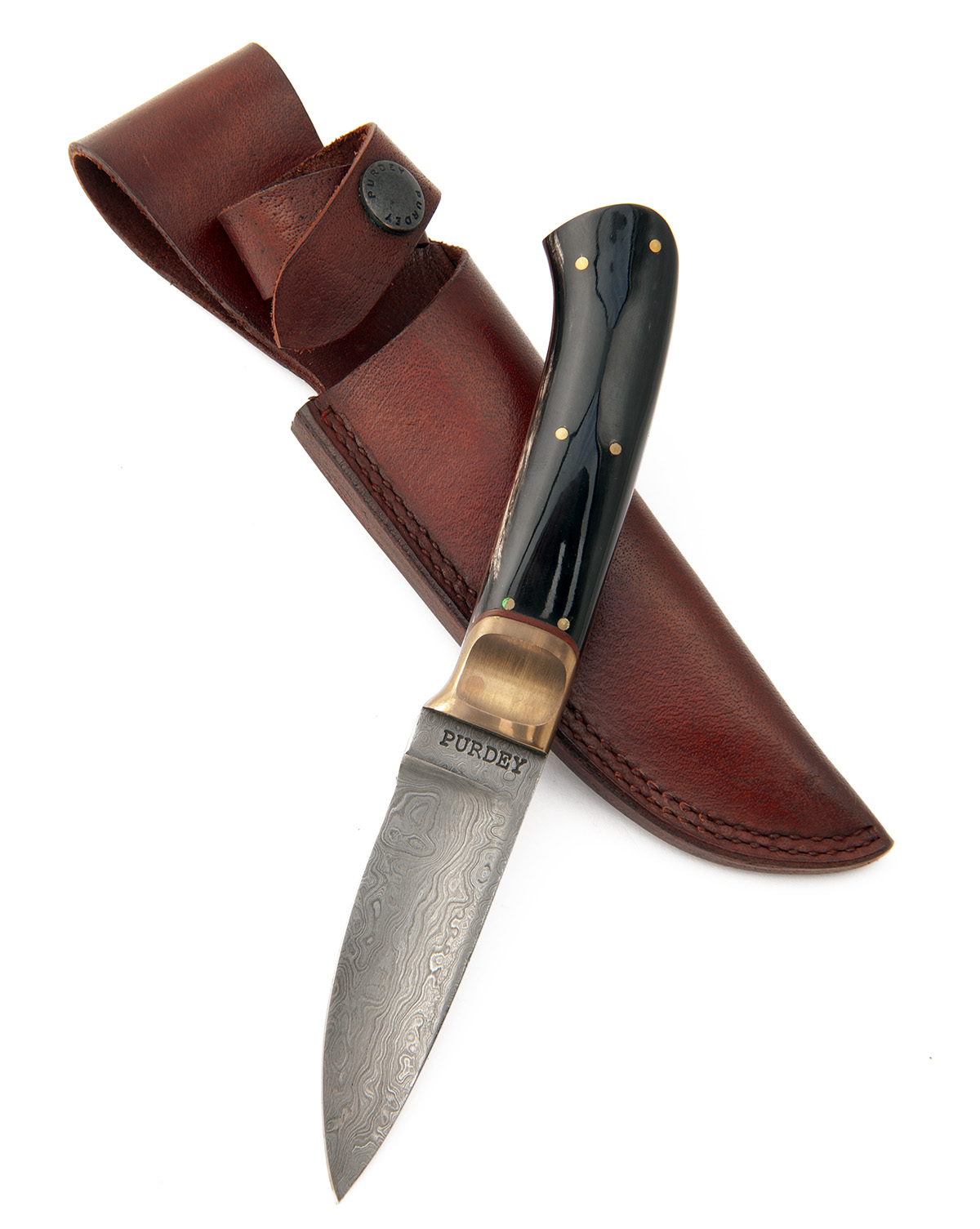 with 3 1/2in. spearpoint blade signed Purdey, buffalo horn handle, brass guard and leather lanyard, leather belt scabbard with Purdey embossed fastener, hook sharpener, in its makers carton