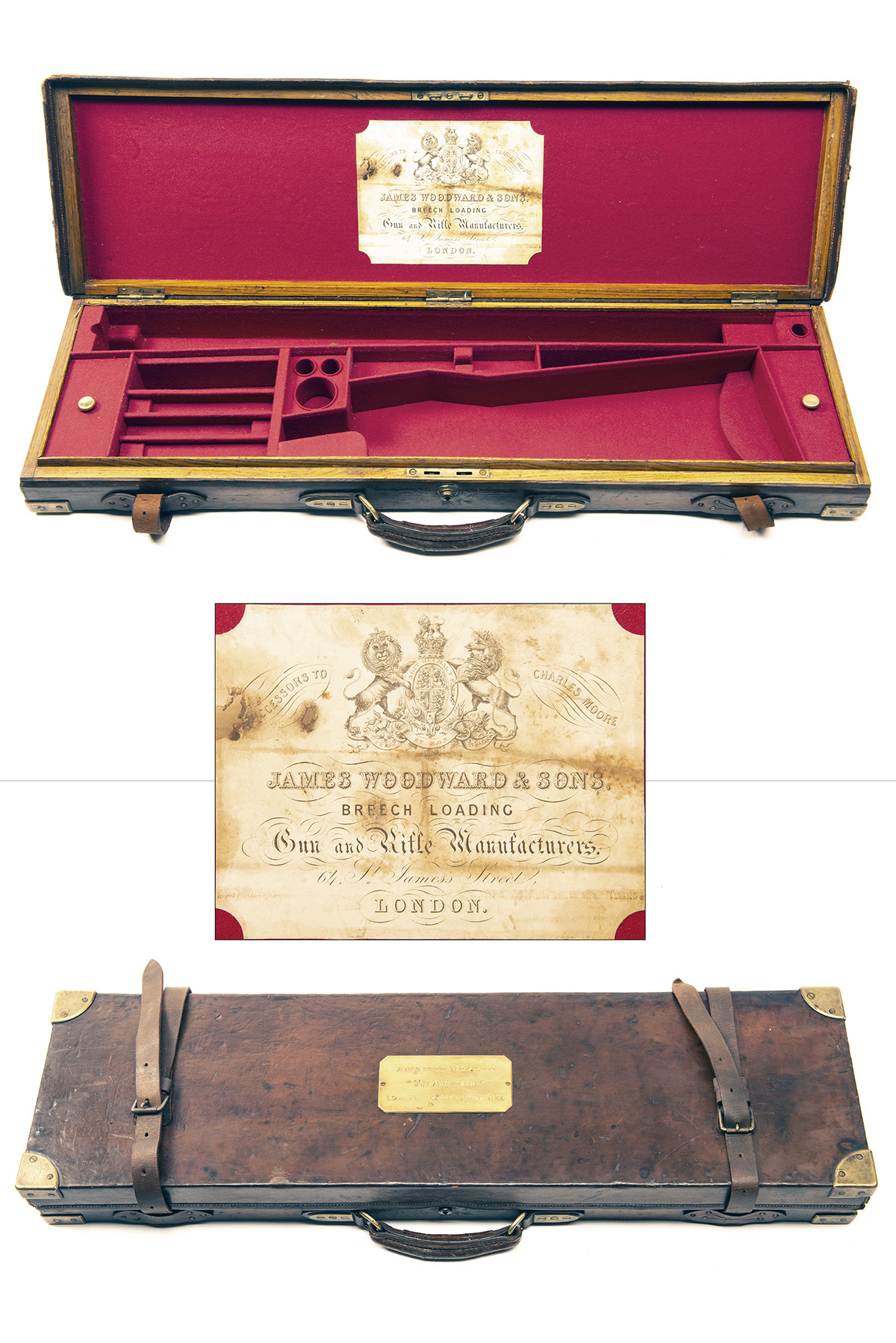 fitted for 29in. barrels (could adapt to 31in.), the interior re-lined with red baize, a paper James Woodward & Sons trade label, central brass push-button lock (key missing), the lid exterior with a central brass plaque with 'JAMES WOODWARD & SONS "The Automatic" T. SOUTHGATE and J. Woodward patent no. 600 of 1876'