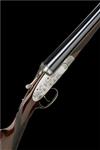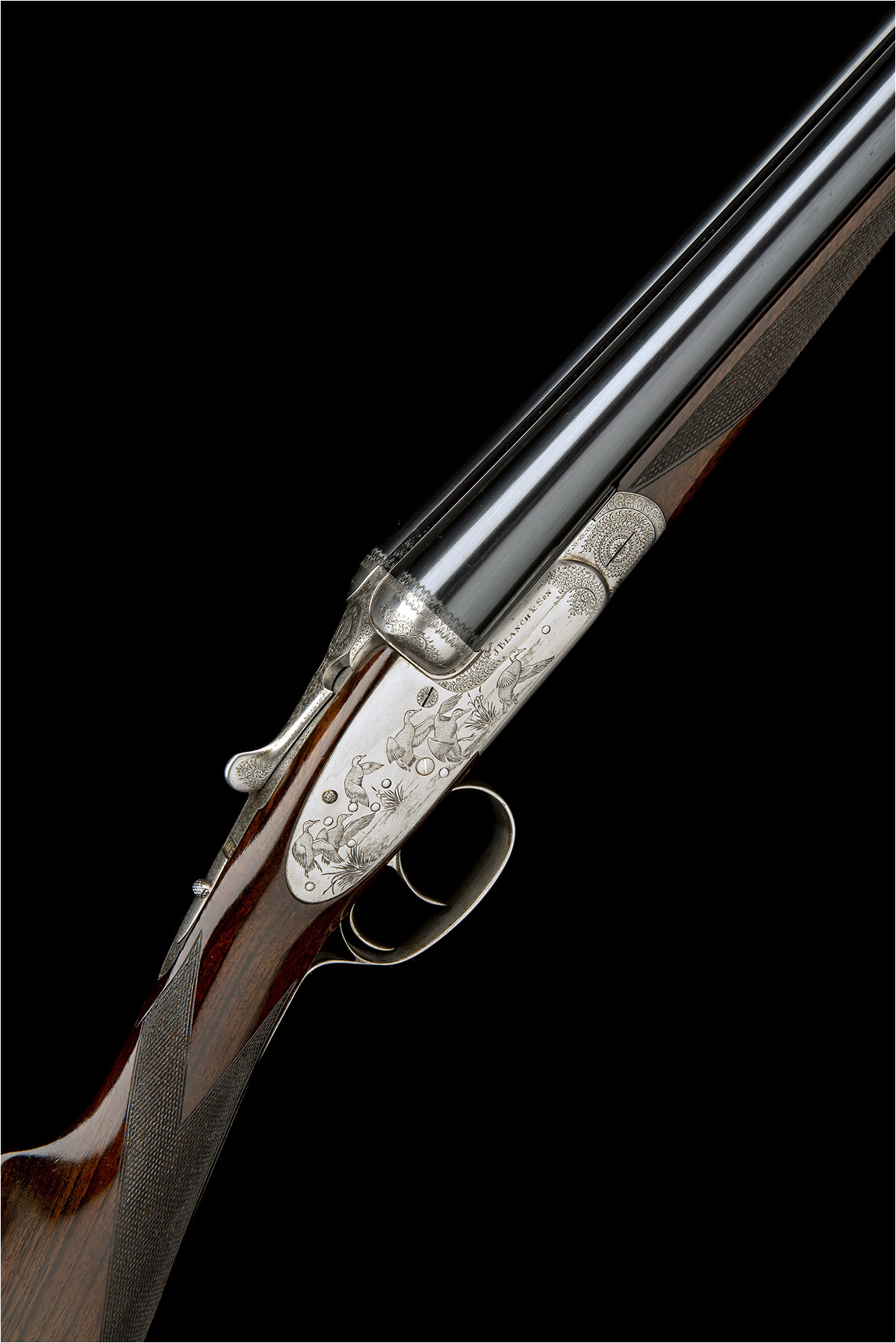 27 5/8in. nitro chopperlump barrels, the rib engraved 'J. BLANCH & SON. (GUNMAKERS). LONDON. ENGLAND.', 2 1/2in. chambers, bored approx. imp. cyl. in both, automatic safety with gold-inlaid 'SAFE' detail, gas checks, gold-inlaid cocking-indicators, partial acanthus scroll engraving, the left lockplate with scenes of partridge in flight over a pastoral panorama, the right with a skein of waterfowl alighting a marshland vista, the underside with a pair of flushed pheasant with a hound in attendance, the triggerplate signed 'D.S. 85', bright finish, 15in. stock including 3/4in. wooden extension, weight 6lb. 12oz.