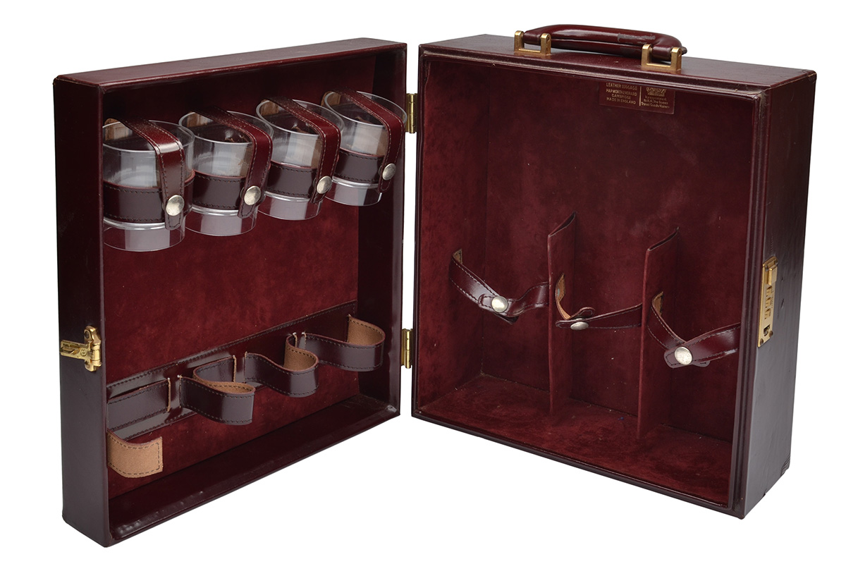 fitted for three large bottles, together with provision for four wine glasses, and four whiskey glasses, the interior lined with red baize, with label reading 'PAPWORTH. LEATHER LUGGAGE. PAPWORTH EVERARD. CAMBRIDGE. MADE IN ENGLAND. BY APPOINTMENT TO H.M. THE QUEEN. TRAVEL GOODS MAKERS.', brass combination lock, leather carry handle, brass fittings