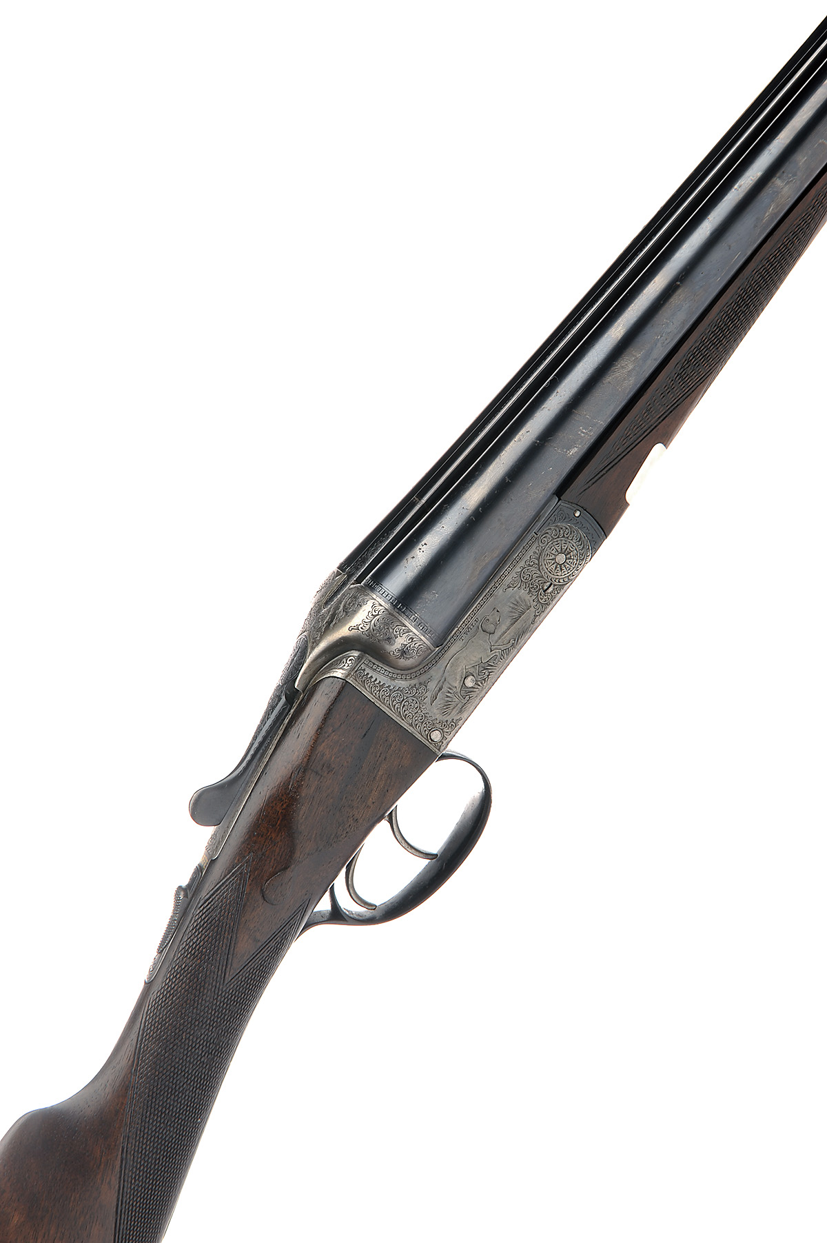 T. WILD 12-BORE BOXLOCK EJECTOR, serial no. 22413, 28in. nitro barrels, the rib engraved 'T. WILD. 17-18. WHITTALL STREET. BIRMINGHAM.', 2 1/2in. chambers, bored approx. 1/4 and 1/2 choke, treble-grip action, automatic safety with gold-inlaid 'SAFE' detail, beaded border and partial acanthus scroll engraving surrounding game scene vignettes, retaining traces of original colour-hardening and finish, 14in. stock including buttplate, weight 6lb. 9oz.