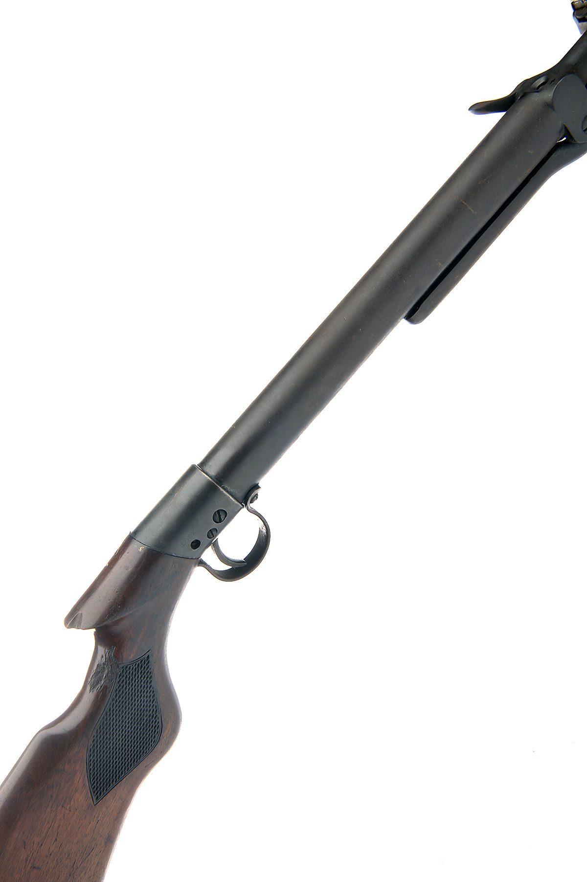 A .22 UNDER-LEVER AIR-RIFLE SIGNED BSA, MODEL 'STANDARD', serial no. S28388, for 1925-26, with sighted 19 1/4in. barrel including rare fore-sight protector, plain air chamber (no etching legible) and walnut saw-handled butt-stock, the whole rusted externally