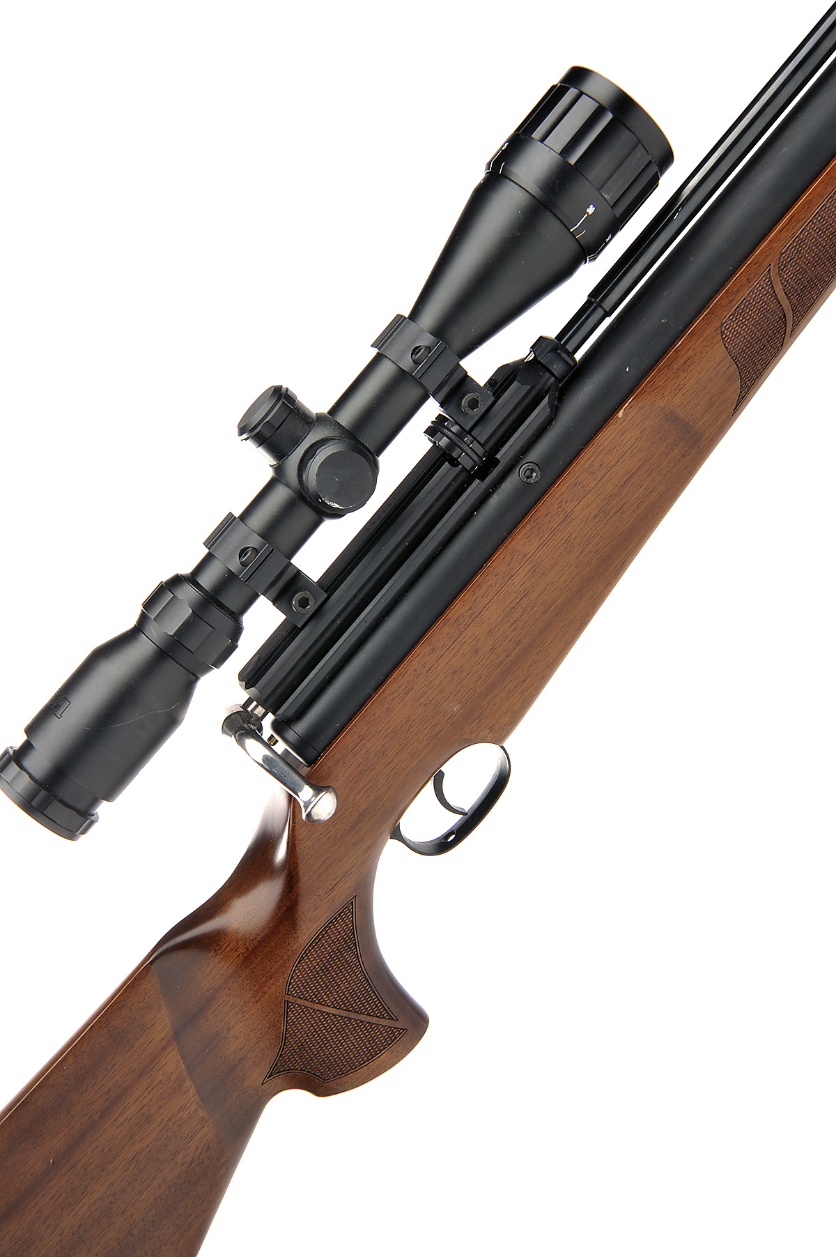 AN FAC-RATED .22 PRE-CHARGED PNEUMATIC AIR-RIFLE SIGNED LOGUN, MODEL 'AXSOR', serial no. 008526 with 29in. barrel including sound moderator, bolt action receiver with rotary magazine, blacked air-reservoir and beech right hand three-quarter stock, fitted with a BSA 3-9x40 telescopic sight, untested