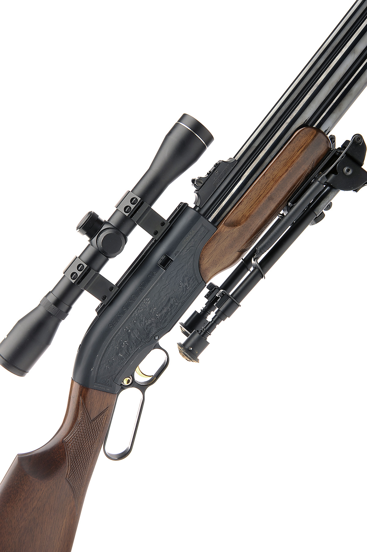A .22 PRE-CHARGED PNEUMATIC AIR-RIFLE SIGNED SHIN-SUNG, MODEL 'CAREER II 707', serial no. 550656, with shrouded 23 1/2in. barrel threaded for a sound moderator (included but not fitted), cast receiver with lever action operation and detachable magazine, chequered butt-stock and fore-end and double under-barrel air-chamber, complete with a folding bipod, a SABRE 4x32 telescopic sight, tools and a double cordura gunbag,