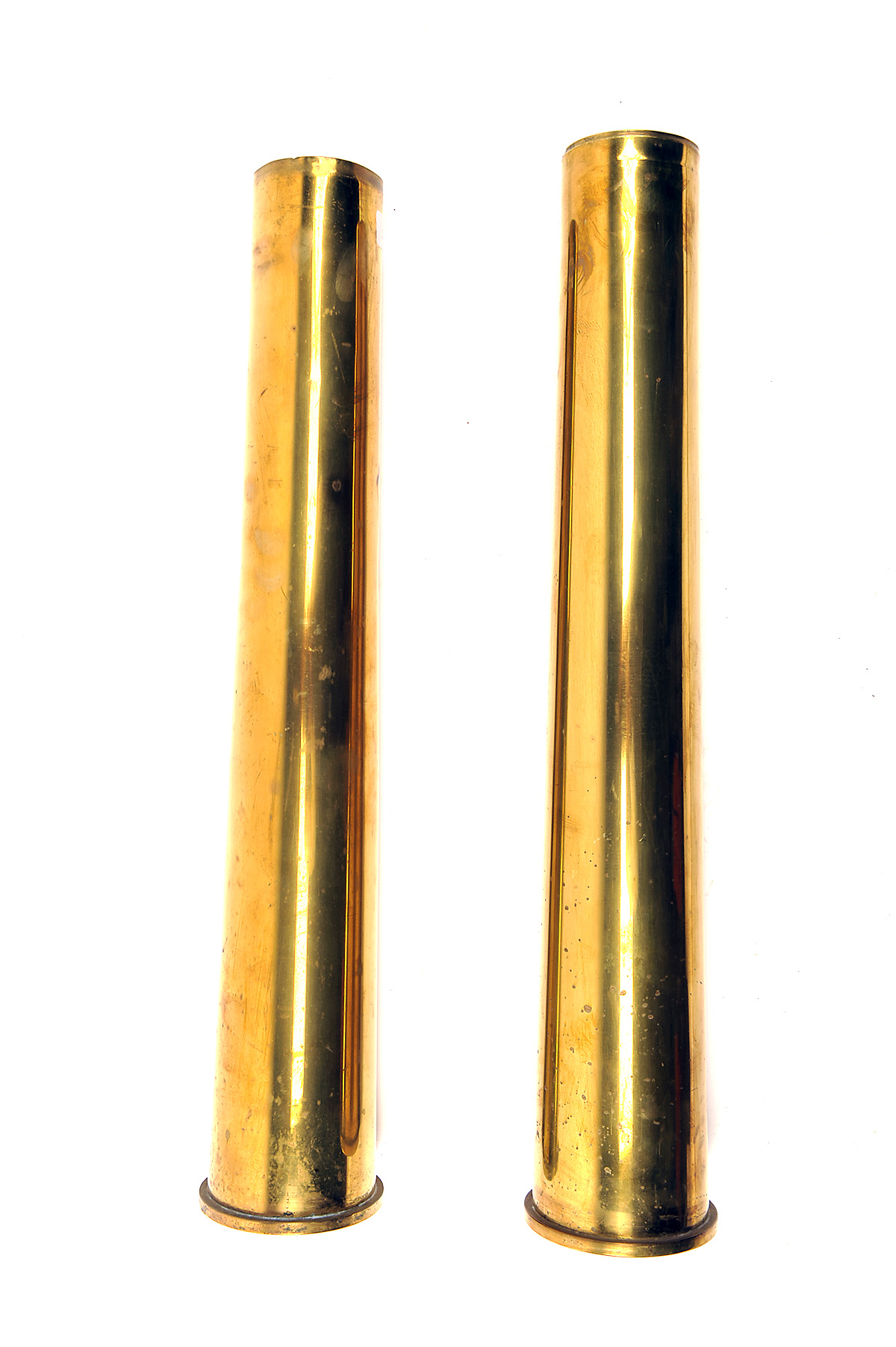** A COMPOSED PAIR OF BRASS 76mm SHELL CASES, both 25in. high overall