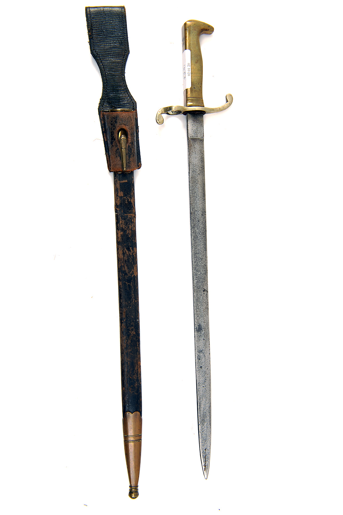 AN UNUSUAL BRASS-HILTED PARADE BAYONET BELIEVED FOR THE MAUSER M71.84 COMMISSION RIFLE, with straight spear-point 17in. blade fully covered with traces of etched scrollwork, nickel cross-guard with forwards and back quillions and muzzle-ring, brass hilt ribbed on one side only with recess for spring (absent) and no push-button or bar channel, complete with its brass
