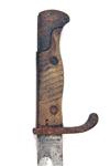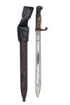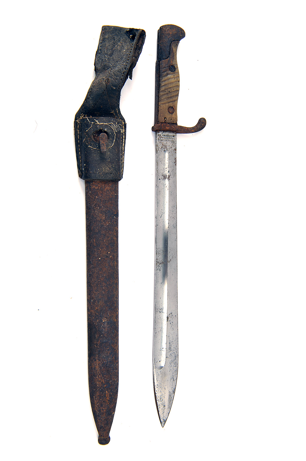 A MAUSER GEW98 BAYONET, signed Mauser, complete with scabbard (rusted) and leather belt frog (distressed)