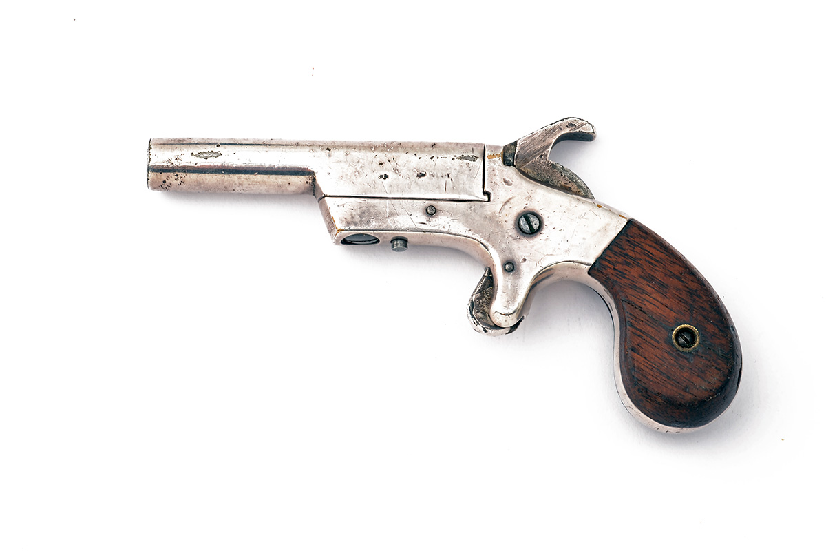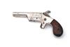 * A .22 (SHORT) SINGLE-SHOT VEST-PISTOL, UNSIGNED, MODEL 'POINTER', serial no. 748, probably American or Belgian circa 1880 and similar to a Thuer patent Colt derringer, with plated London proved 2 3/4in. barrel, plated open frame with push button barrel lock, exposed hammer and slab-sided wood bag-shaped grips