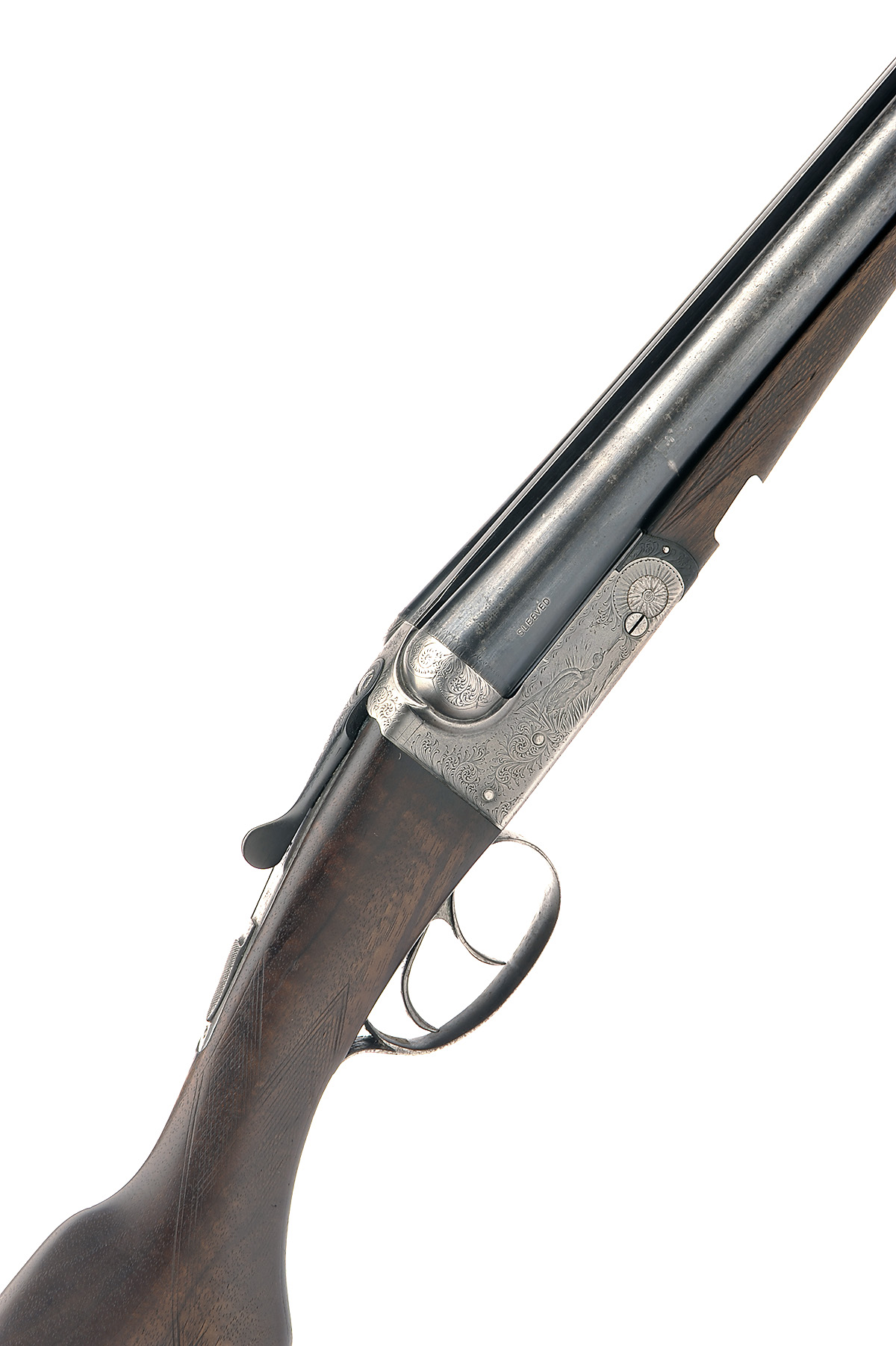 B.S.A. 12-BORE BOXLOCK EJECTOR, serial no. 42439, 26in. sleeved nitro barrels, 2 1/2in. chambers, bored approx. imp. cyl. and 1/2 choke, automatic safety, acanthus scroll engraving surrounding game scenes, 15in. semi-pistolgrip stock