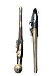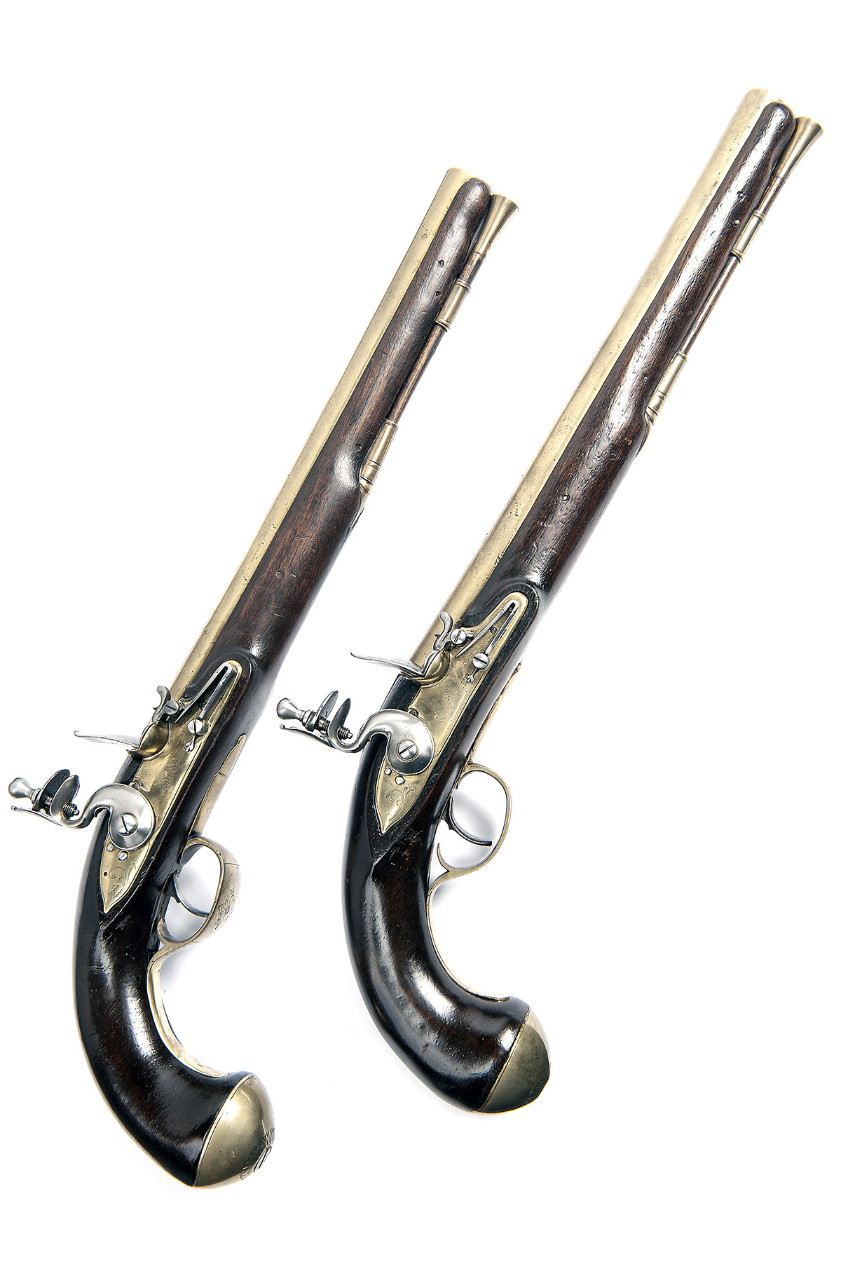 AN IMPRESSIVE EARLY PAIR OF 20-BORE FLINTLOCK BRASS-BARRELLED HORSE-PISTOLS, no visible serial numbers,