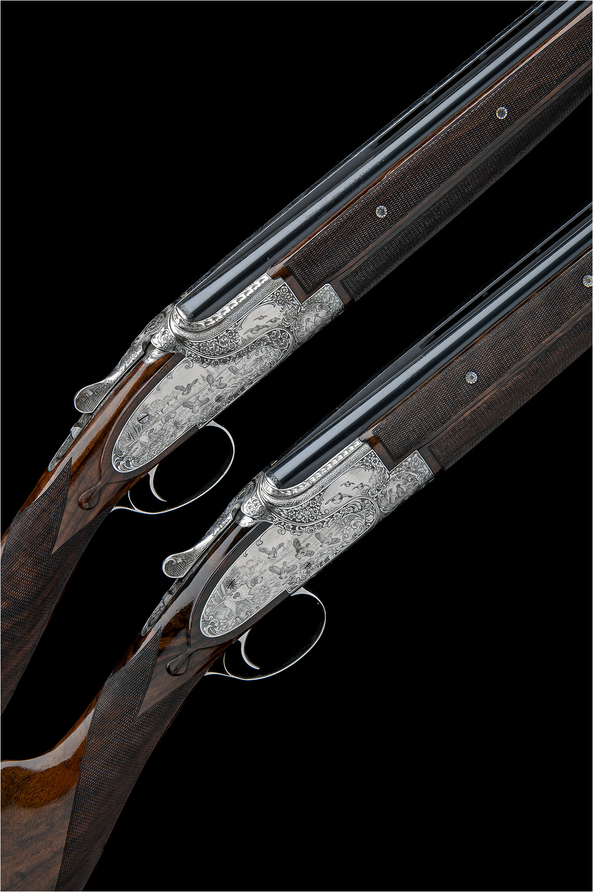 28in. nitro barrels with 6mm ventilated matt top-ribs, gold-inlaid '1' and '2' at the breech ends, 2 3/4in. chambers (No.1) and 3in. chambers (No.2), bored approx. imp. cyl. and 1/4 choke, three-piece fore-ends, the release levers gold-inlaid '1' and '2', hold-open toplevers gold-inlaid '1' and '2', manual safeties with gold-inlaid 'O', 'U' and 'S' details, the actions, decorative sideplates and furniture finely engraved with scrolling floral and acanthus designs, surrounding finely engraved game scenes of pointer and pheasant, pointer and English partridge, the undersides with grouse in flight, the triggerplate signed 'R. CAPECE' on the No.1 gun, bright finish, 15in. highly-figured roachbelly stocks, weight 6lb. 12oz., in a leather double motor case