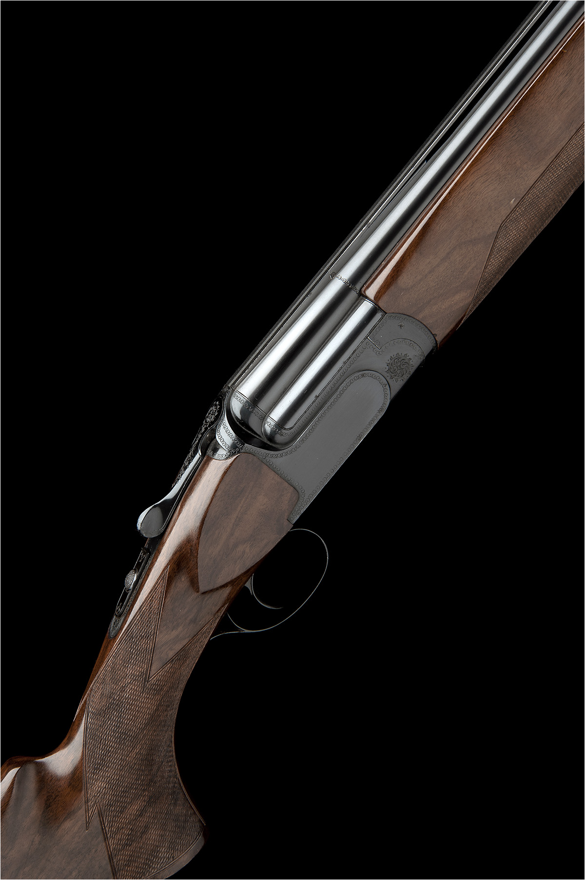 33 3/4in. nitro barrels with 10mm ventilated matt top-rib, ventilated mid-rib, 2 3/4in. chambers, bored approx. 1/4 and 1/2 choke, hold-open toplever, manual safety with integral barrel selector switch, border engraved black action, 15in. figured pistolgrip stock including 1/2in. rubber recoil pad, weight 8lb. 5oz., in its universal case with some paperwork