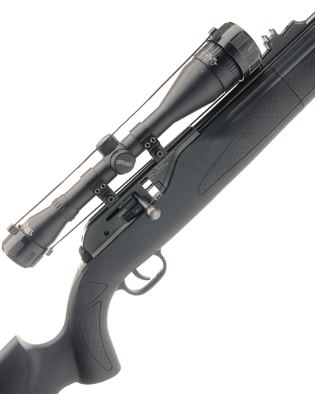 A BOXED .177 CO2 POWERED REPEATING AIR-RIFLE SIGNED UMAREX, MODEL 850 AIR-MAGNUM', serial no. G019979, recent, with blued 23 1/2in. barrel, anodised receiver, rotary magazine, abs plastic furniture and fitted with a 'WALTHER' 6x42 telescopic sight, TOGETHER WITH its manufacturers card and polystyrene carton with some accessories including air adaptor