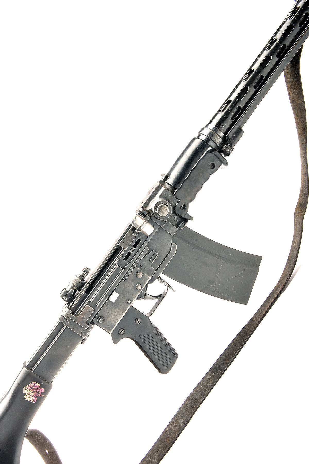 A 7.5mm (SWISS) SEMI-AUTOMATIC ASSAULT-RIFLE, MODEL 'SIG STGW 57', serial no. A546454, circa 1970, with 26 1/2in. barrel including flash-hider, folding tunnel-fore-sight, folding adjustable diopter rear-sight, iron ventilated hand-guard, pressed-metal receiver and frame, three-position selector (currently semi automatic only), black rubber-coated butt-stock, black plastic pistol-grip, detachable box magazine, black plastic fore-grip and integral folding bi-pod, fitted with a Swiss military leather sling