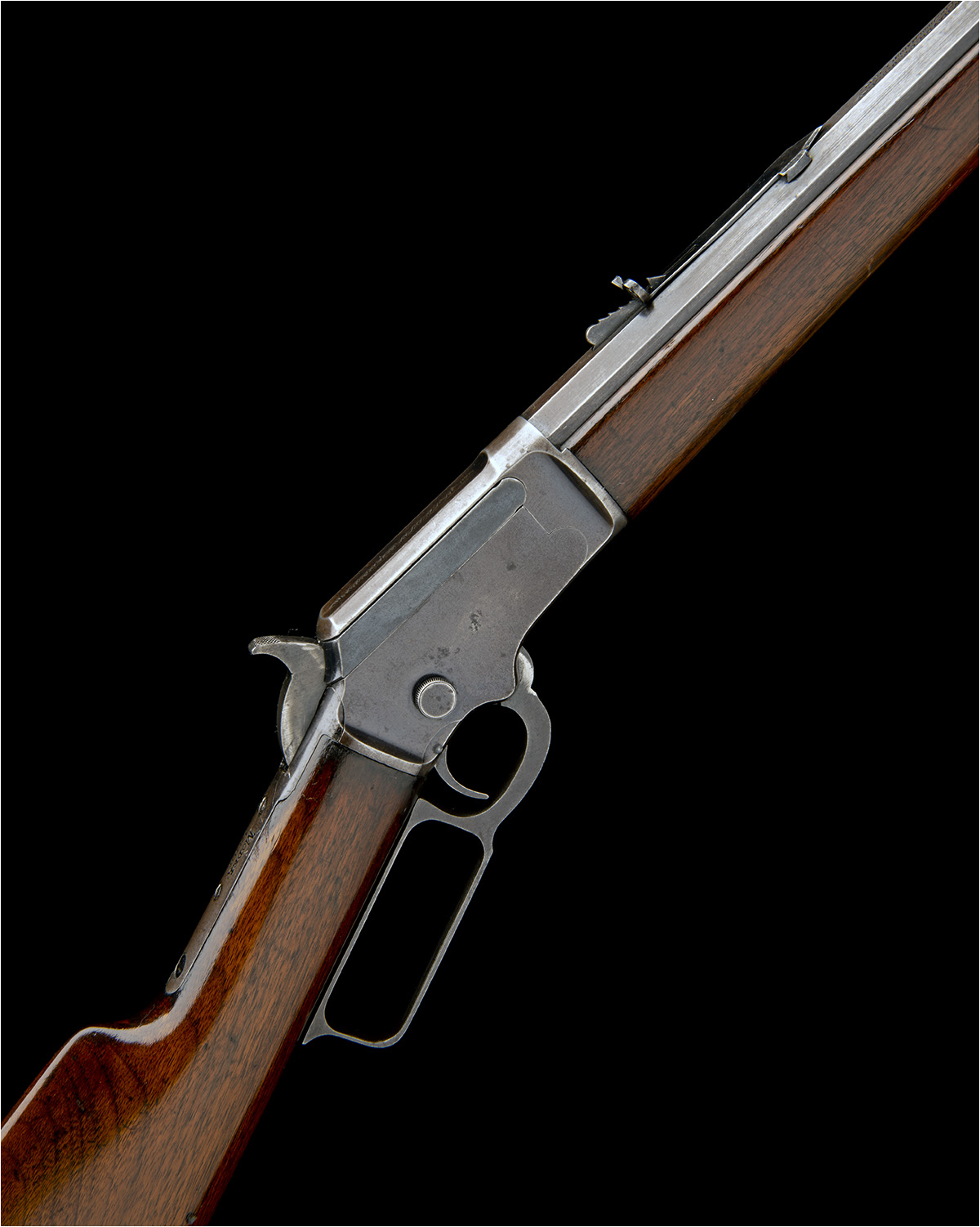 circa 1900, with round 24in. barrel, dove-tailed 'Rocky Mountain' nickel-bladed fore-sight, buckhorn rear-sight, the solid frame marked 'MARLIN SAFETY' on the top and fitted with detachable sideplate, the top-tang with model designation, walnut butt-stock with iron crescent heel-plate, plain walnut fore-end and full length under-barrel magazine tube
